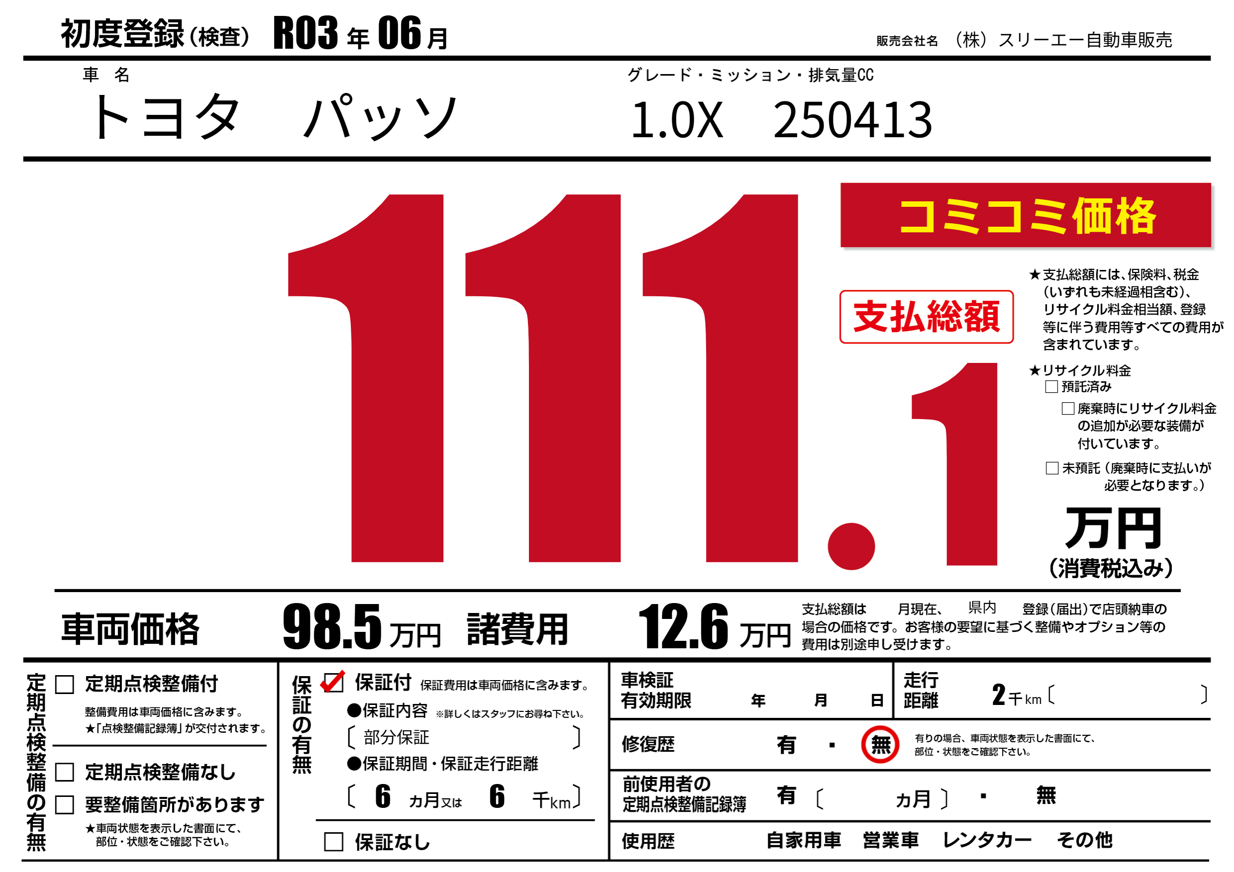 保証付き 保証内容(部分保証) 6ヶ月または(6)千kmまで |