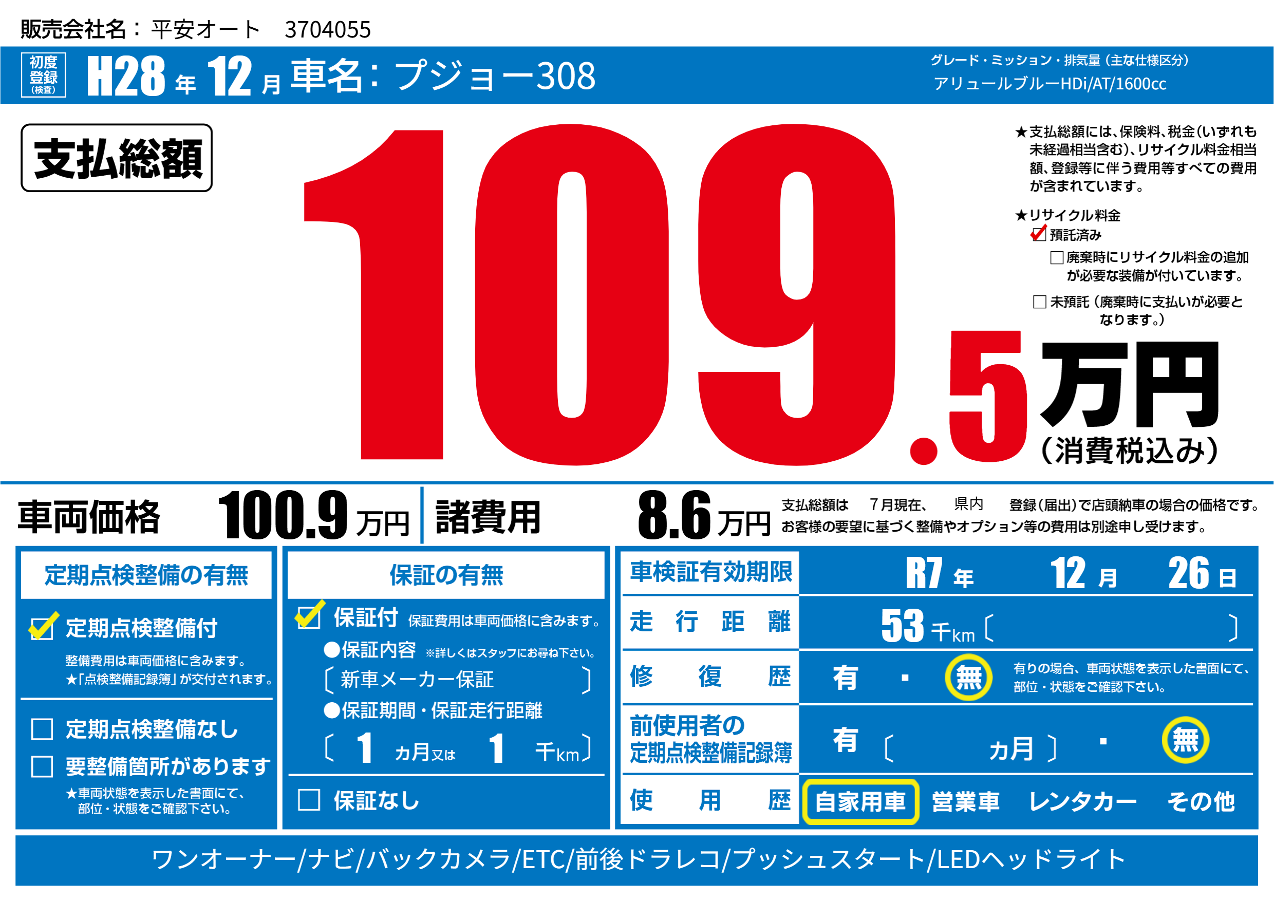 | 車名 | プジョー308 | グレード ミッション 排気量 |