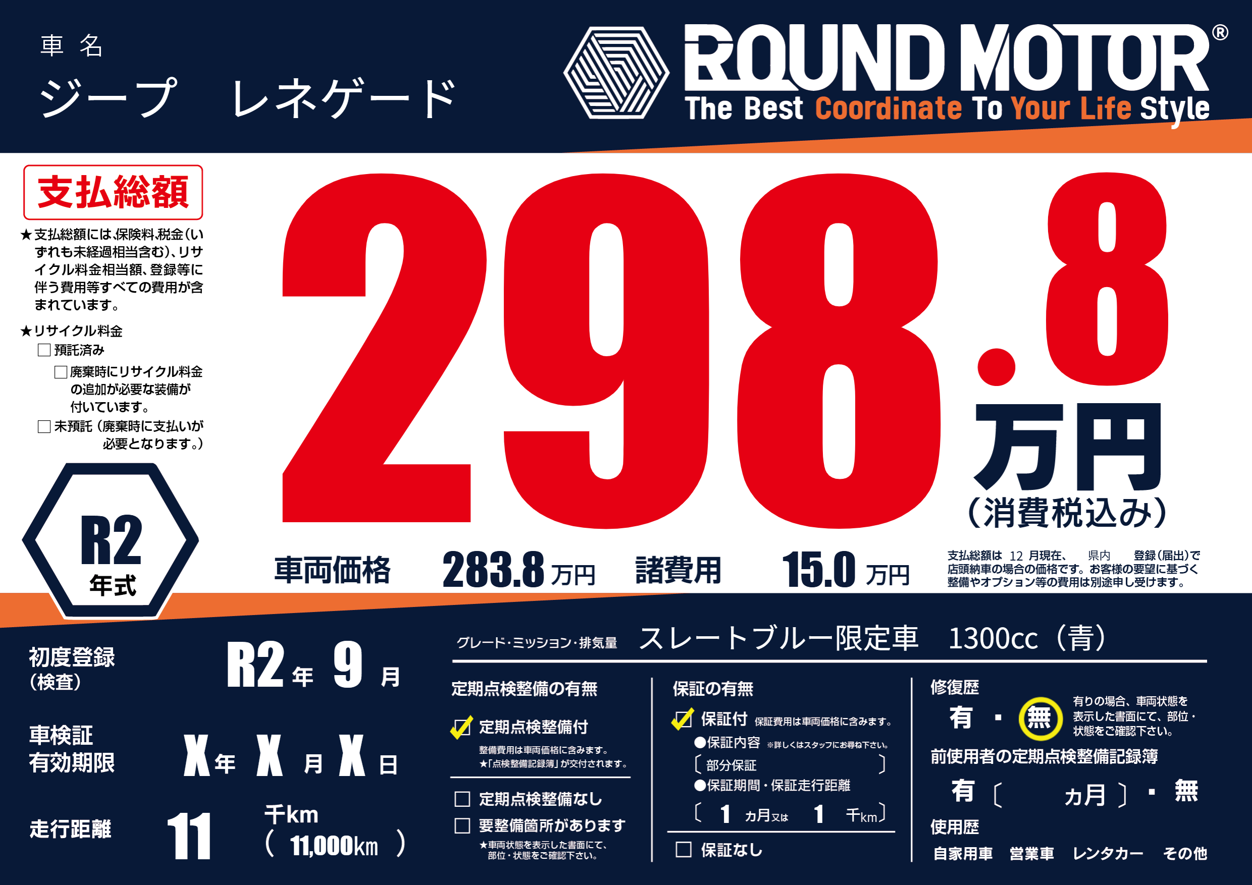 | 走行キロ | 1.1万km | 初年度登録 | R2年9月 |