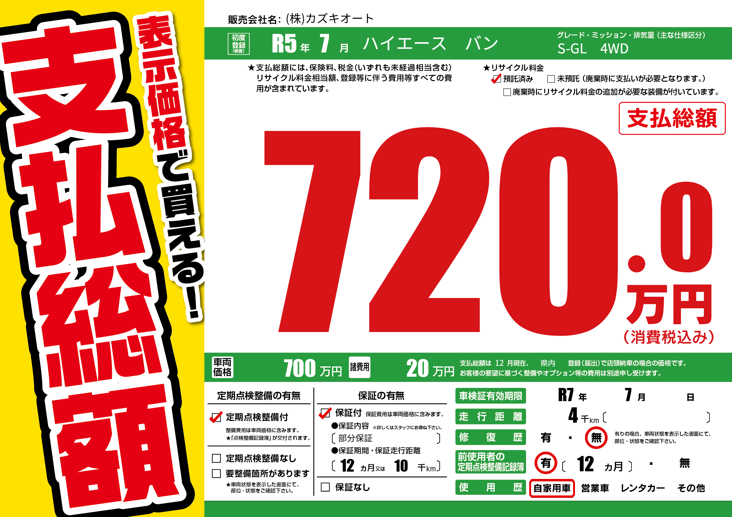 | 車名 | ハイエース バン | グレード ミッション 排気量 |