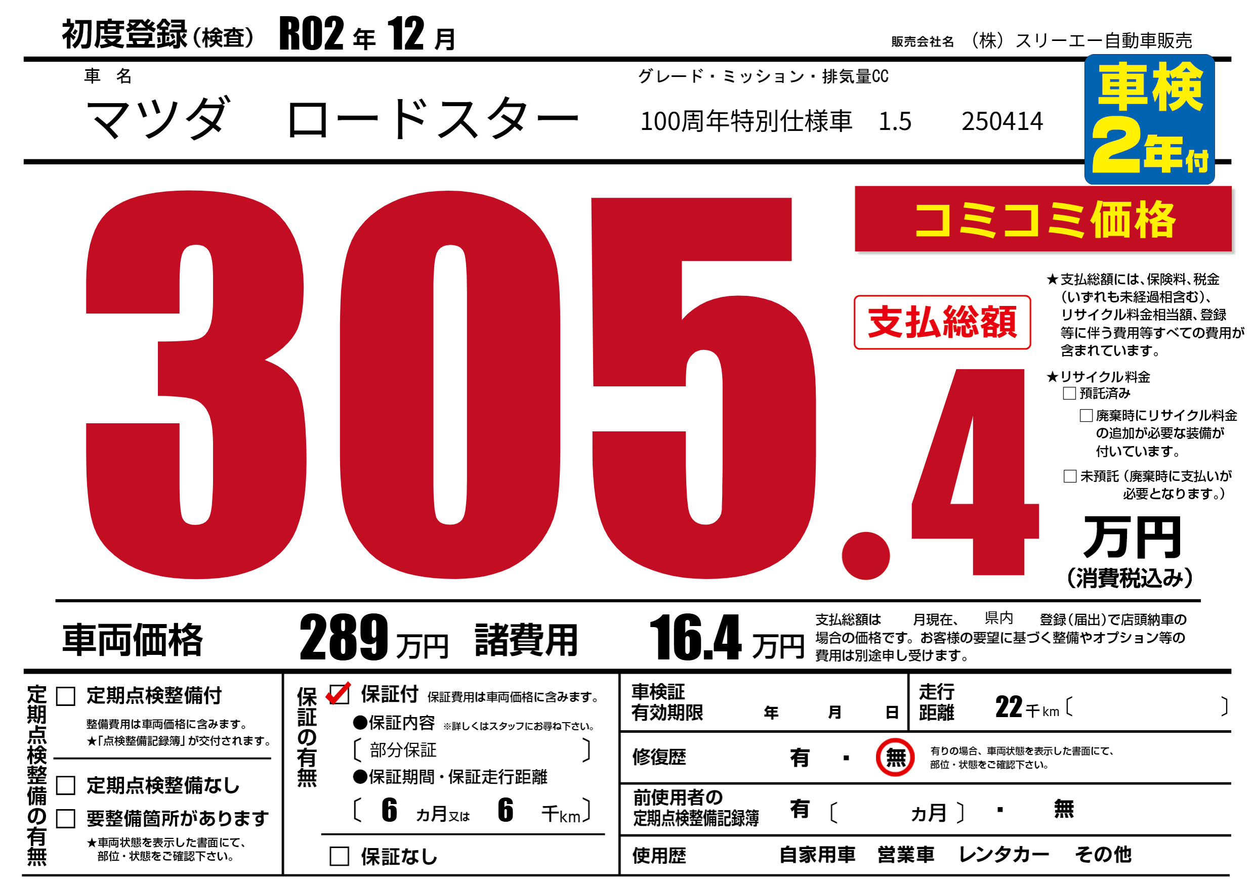 | 車名 | マツダ ロードスター | グレード ミッション 排気量 |