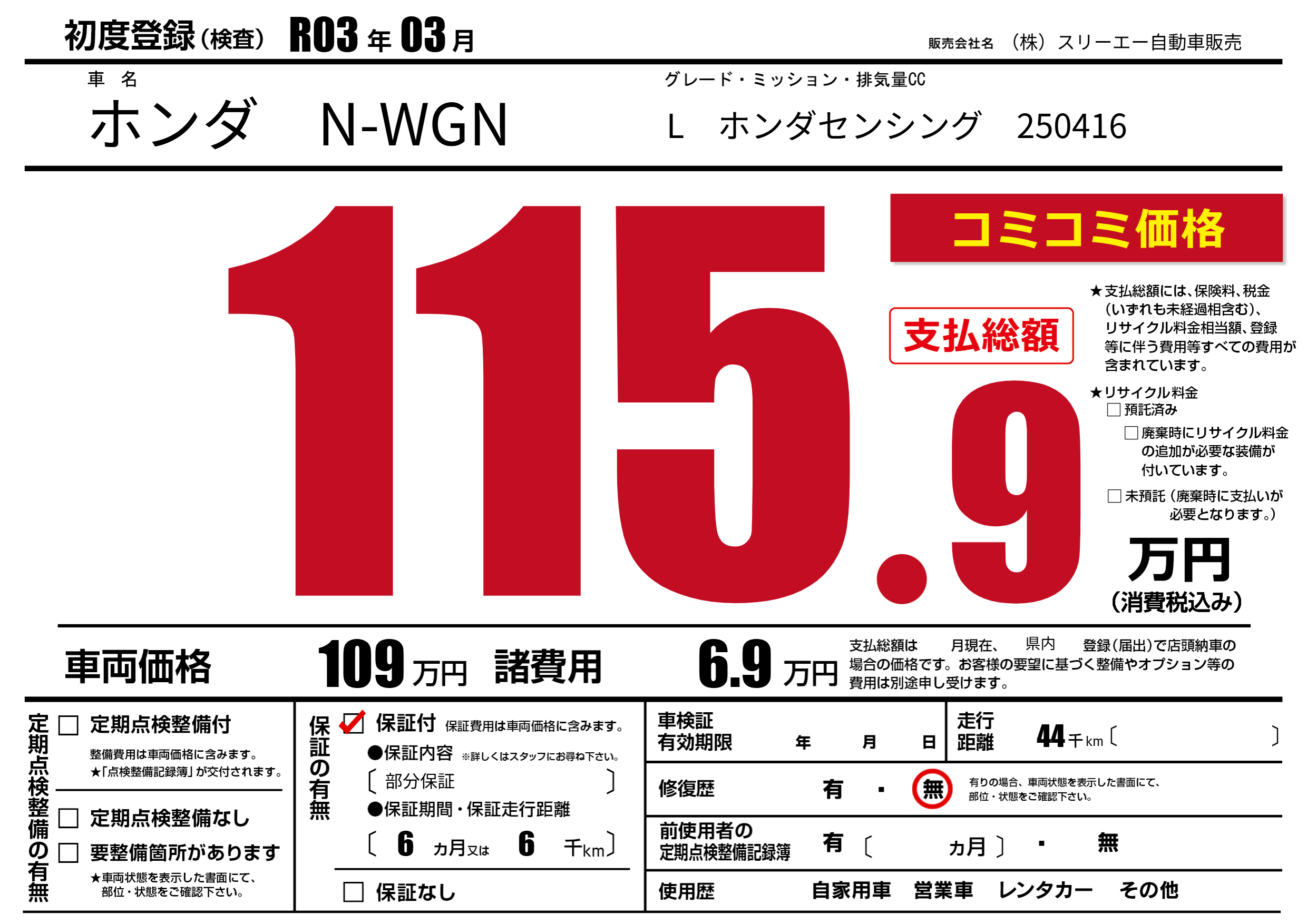 保証付き 保証内容(部分保証) 6ヶ月または(6)千kmまで |