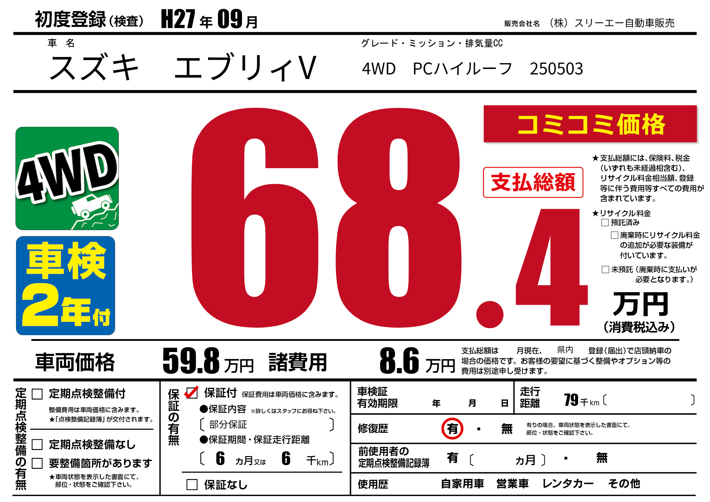 保証付き 保証内容(部分保証) 6ヶ月または(6)千kmまで |