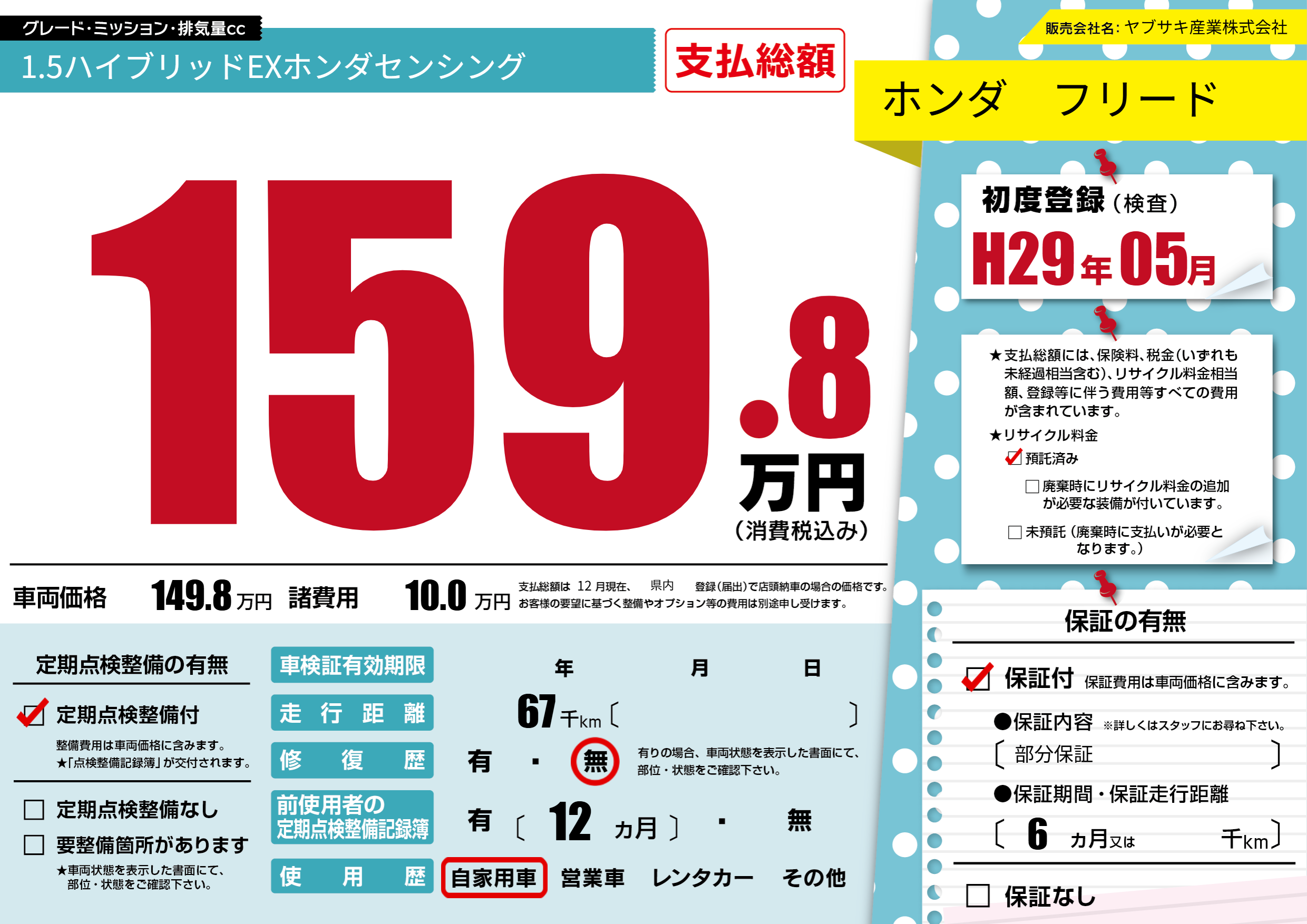 | 走行キロ | 6.7万km | 初年度登録 | H29年05月 |