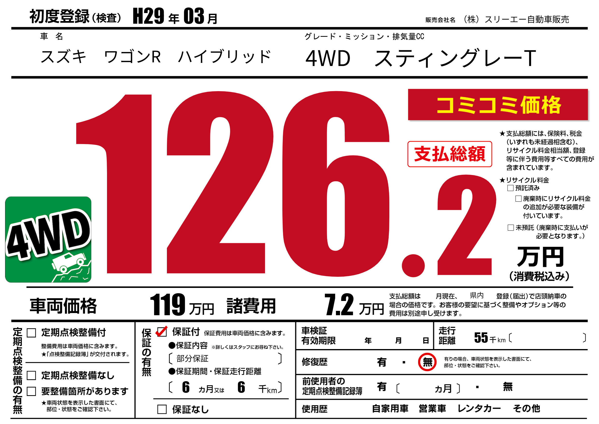 | 車名 | スズキ ワゴンR ハイブリッド | グレード ミッション 排気量 |