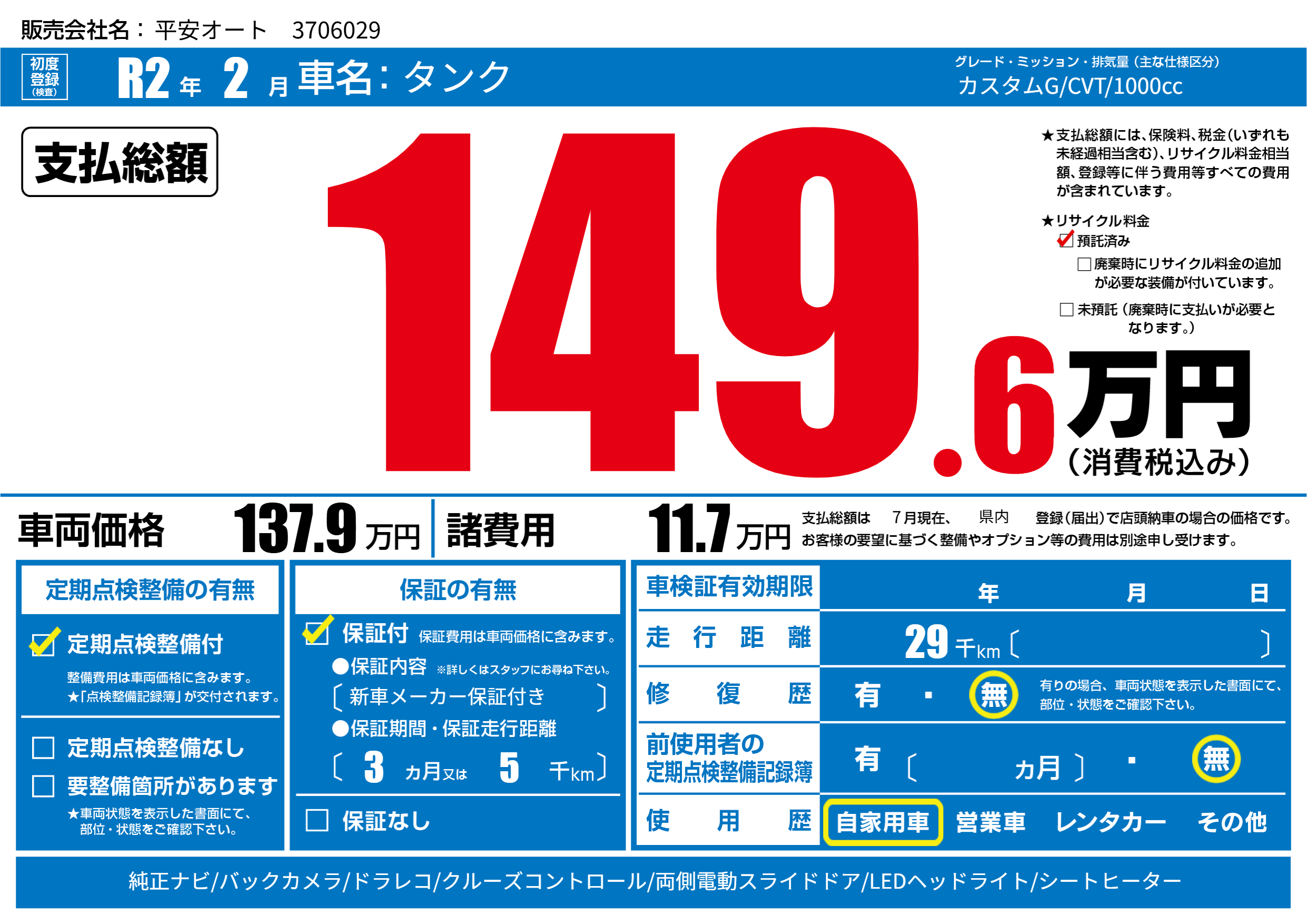 | 走行キロ | 2.9万km | 初年度登録 | R2年2月 |