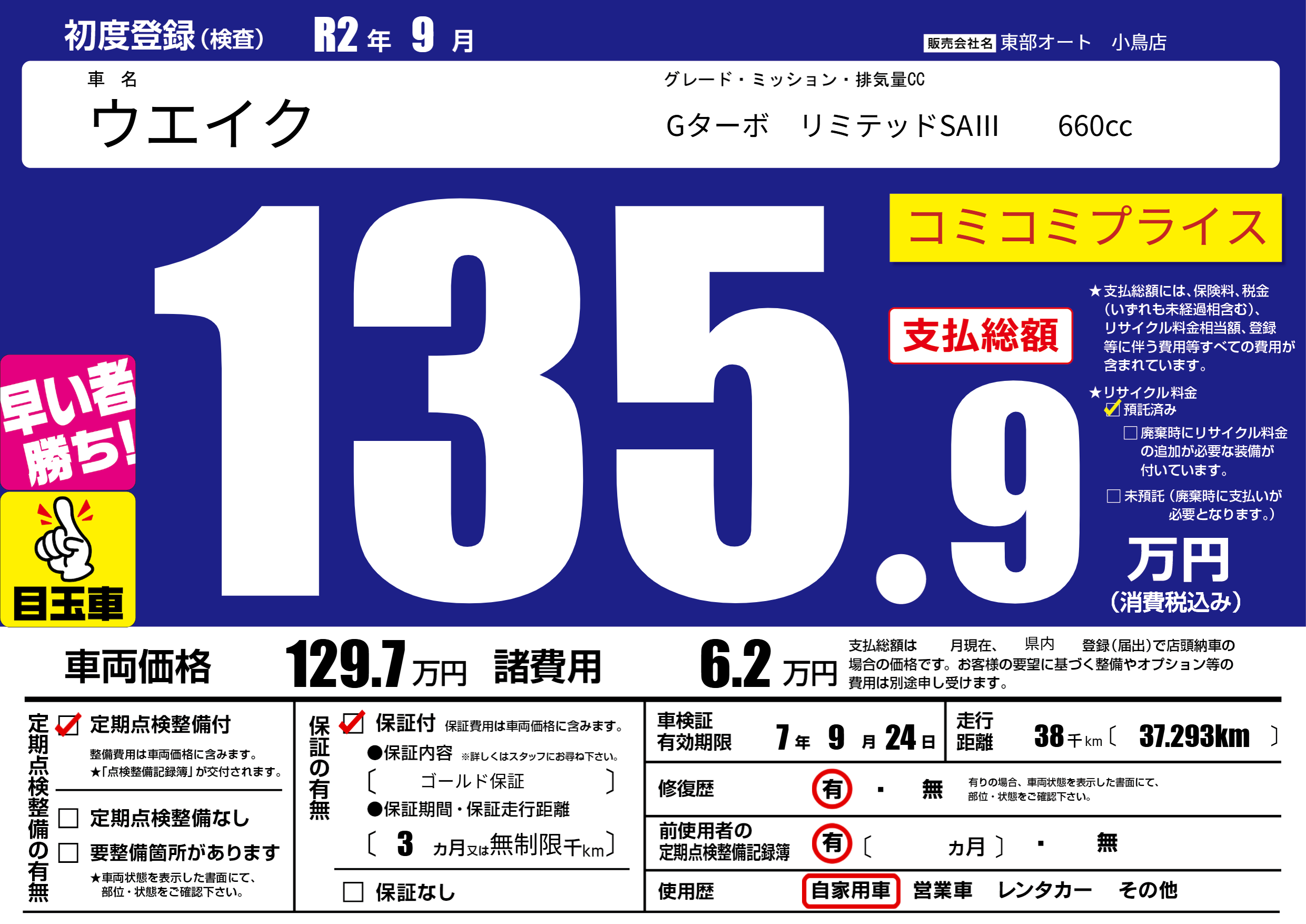 | 走行キロ | 3.8万km | 初年度登録 | R2年9月 |