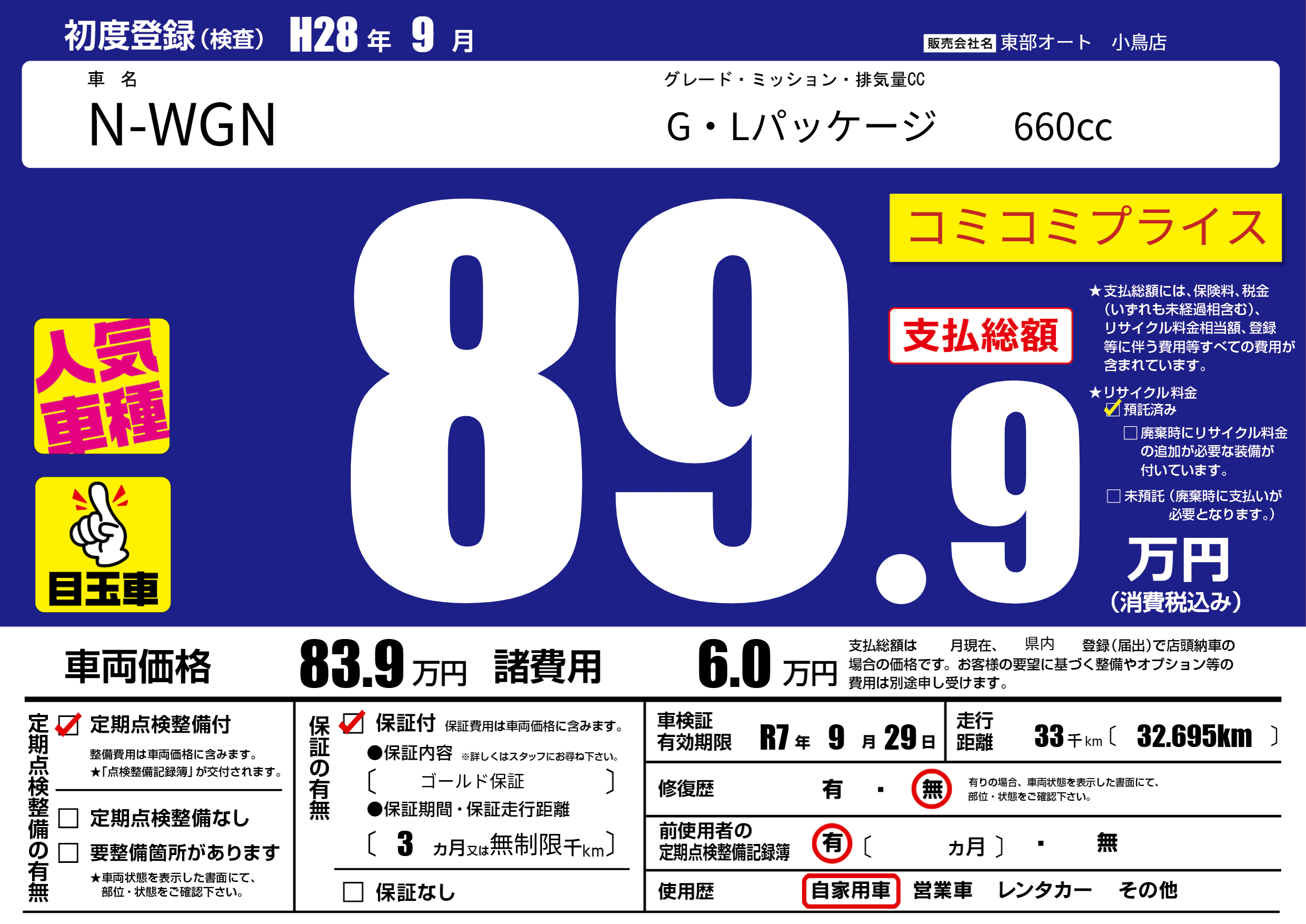 | 車検制限 | R7年 9月 29日 | ||