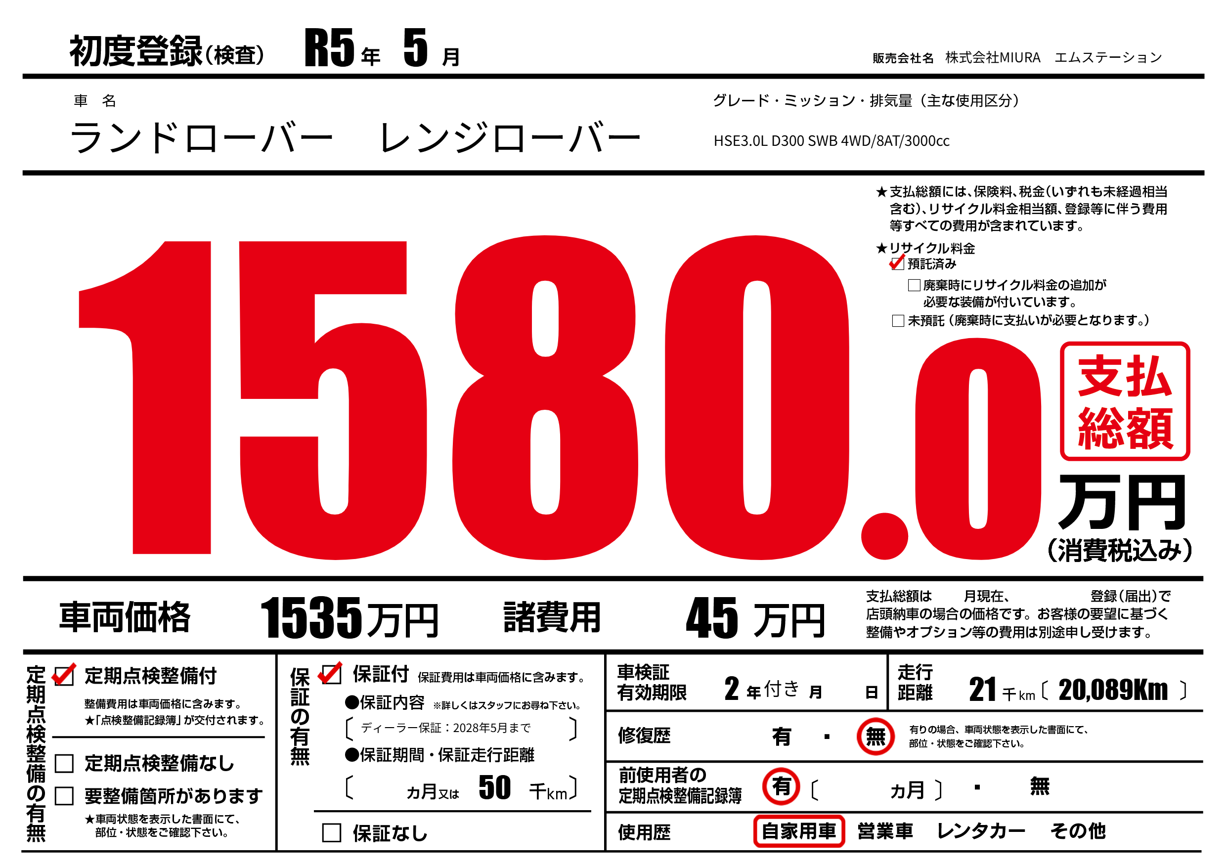 保証付き 保証内容(ディーラー保証:2028年5月まで) ---ヶ月または(50)千kmまで |