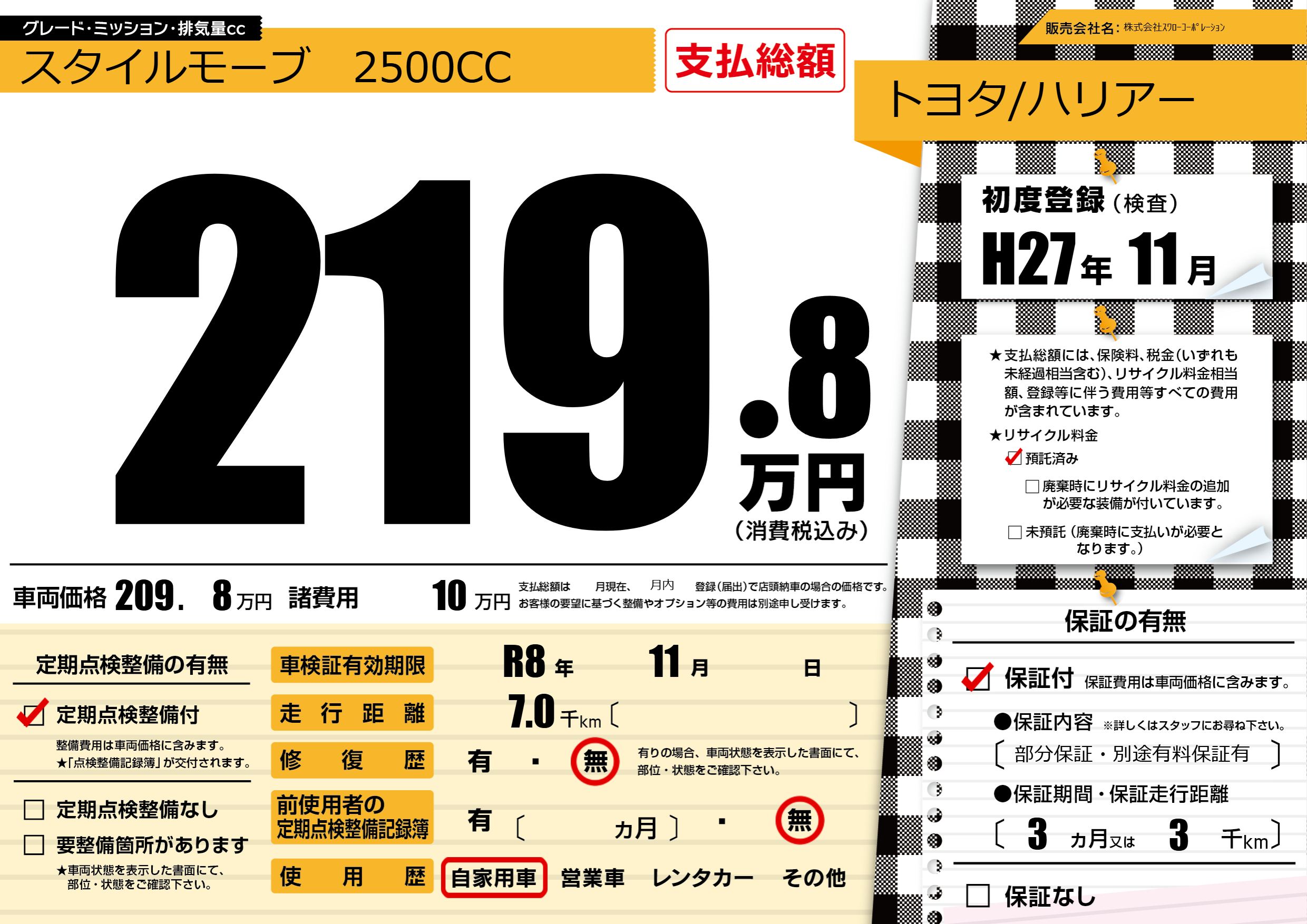 | 走行キロ | 0.7万km | 初年度登録 | H27年11月 |