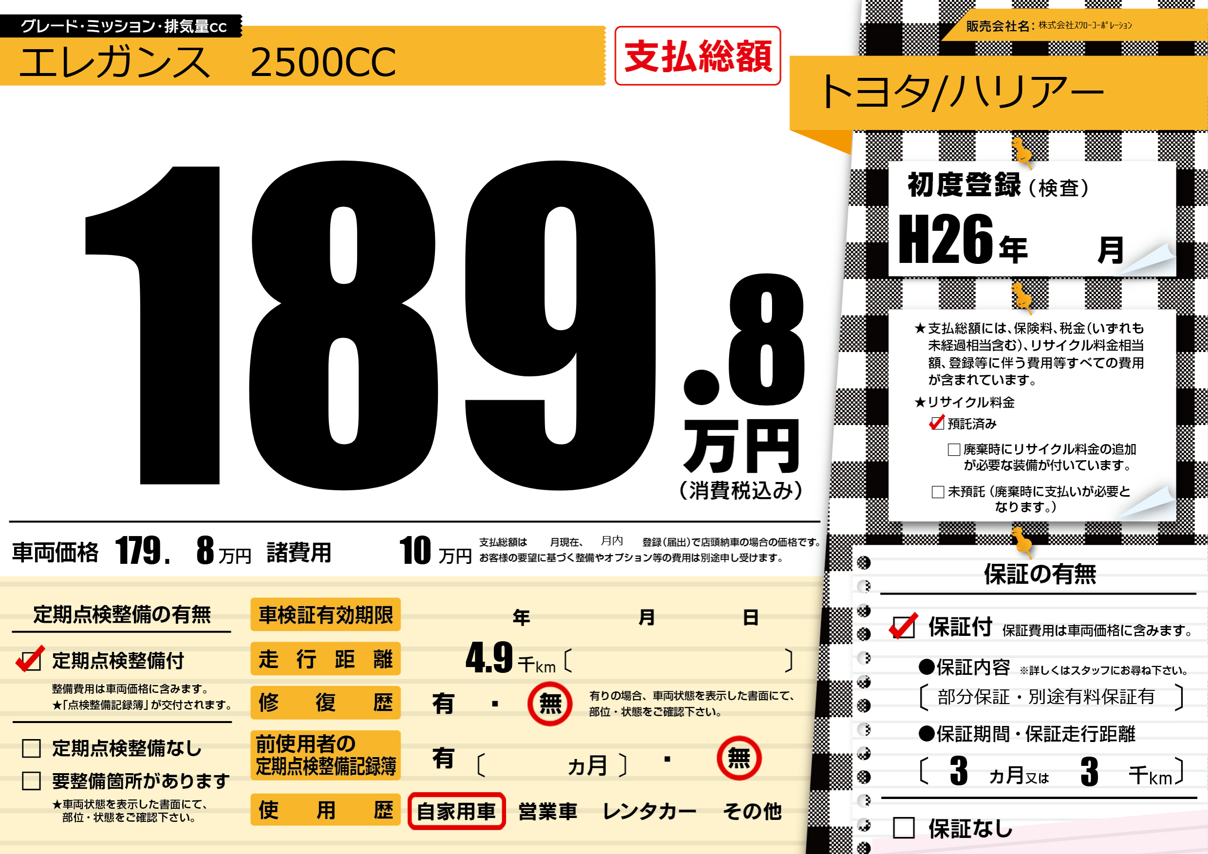 | 車名 | トヨタ/ハリアー | グレード ミッション 排気量 |