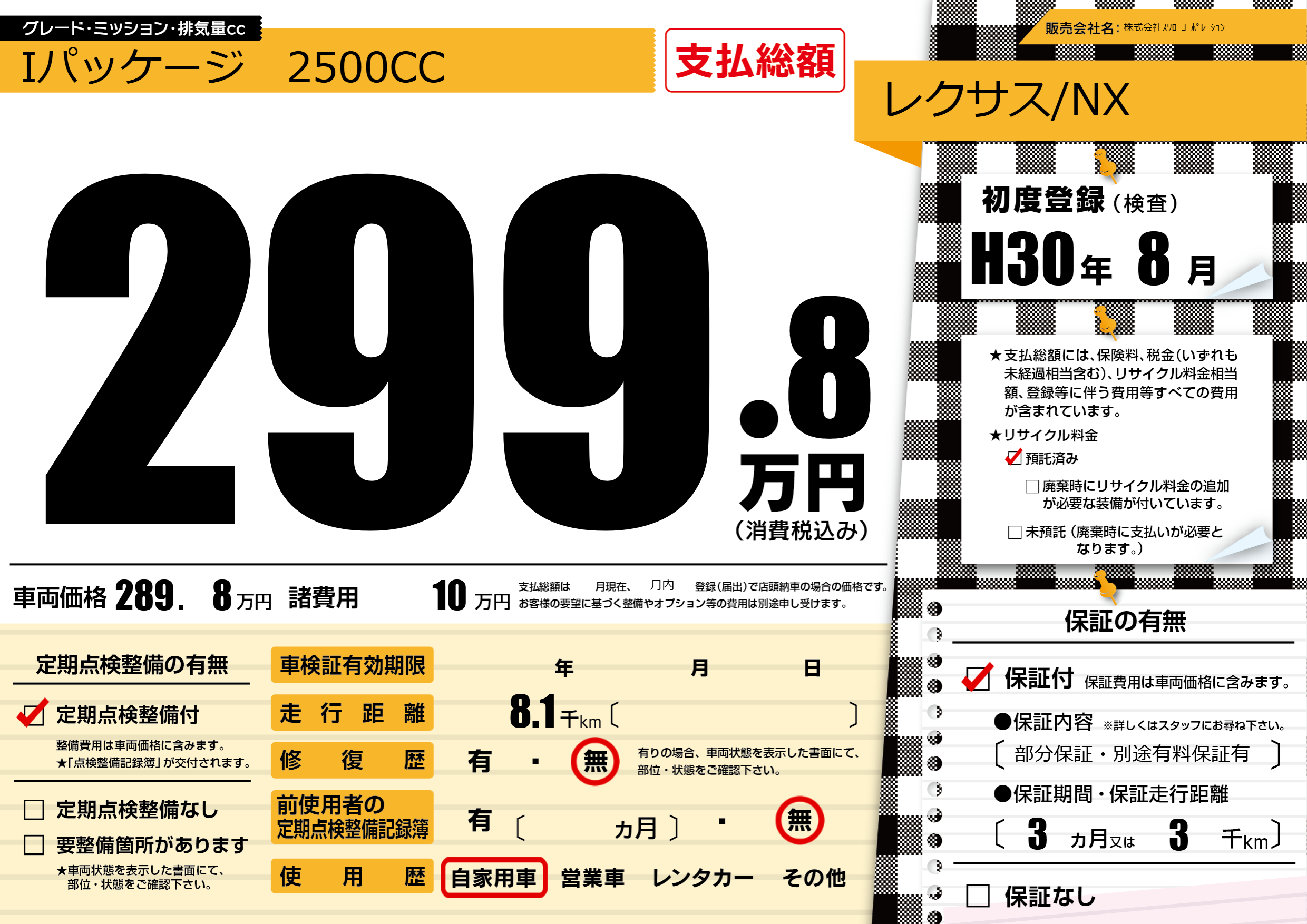 | 車名 | レクサス/NX | グレード ミッション 排気量 |