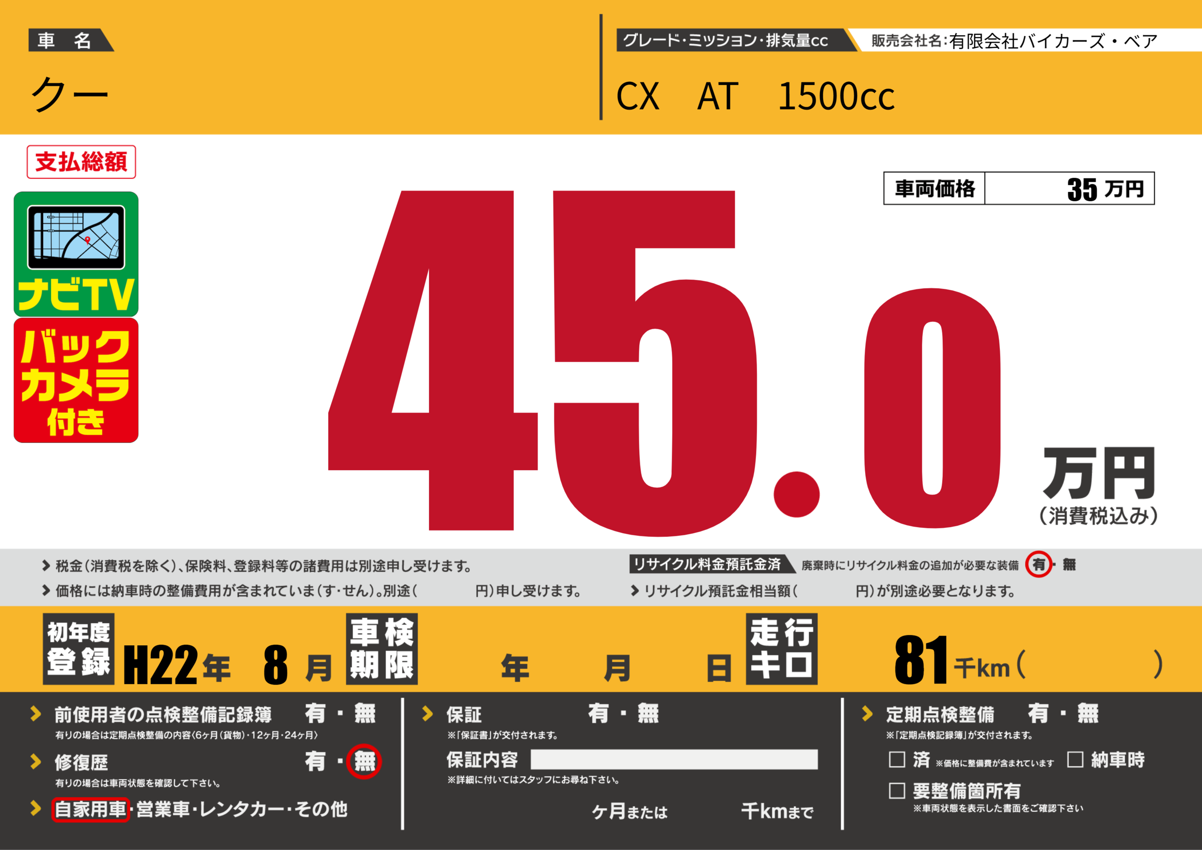 | 走行キロ | 8.1万km | 初年度登録 | H22年8月 |