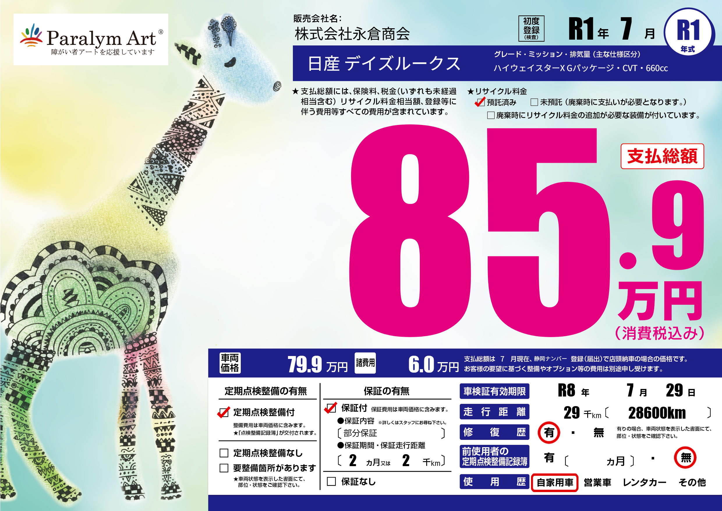 | 車名 | 日産 デイズルークス | グレード ミッション 排気量 |