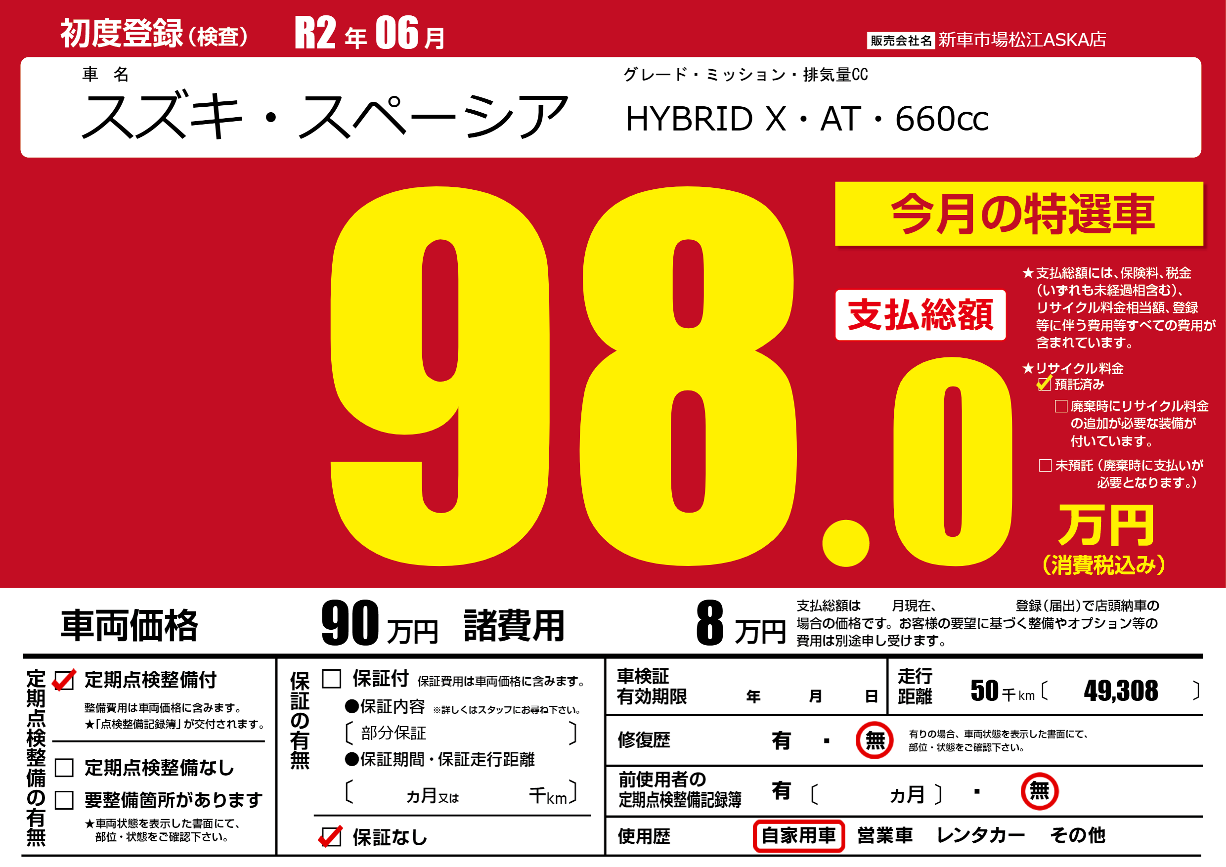 | 走行キロ | 5万km | 初年度登録 | R2年06月 |