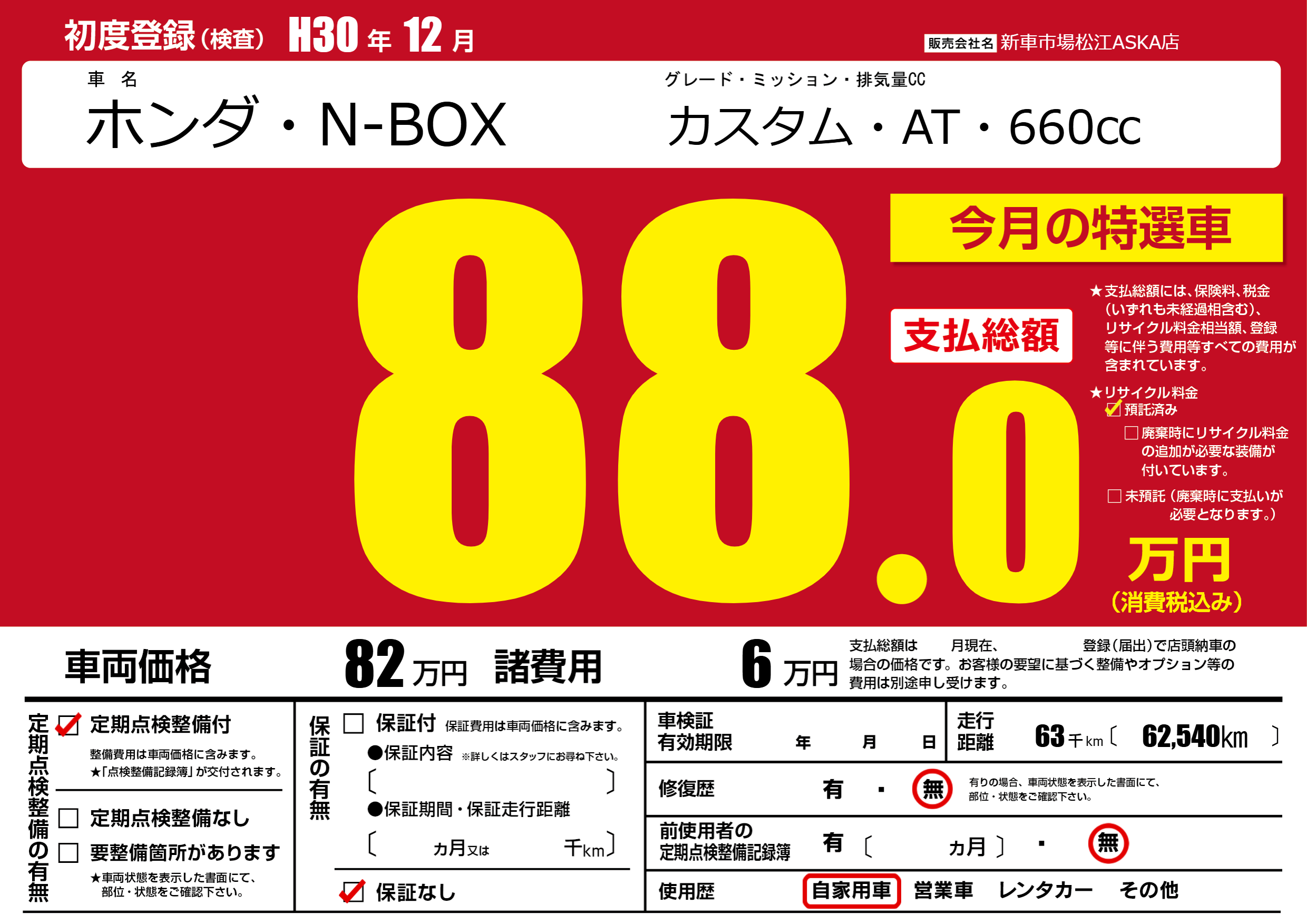 | 車名 | ホンダ・N-BOX | グレード ミッション 排気量 |