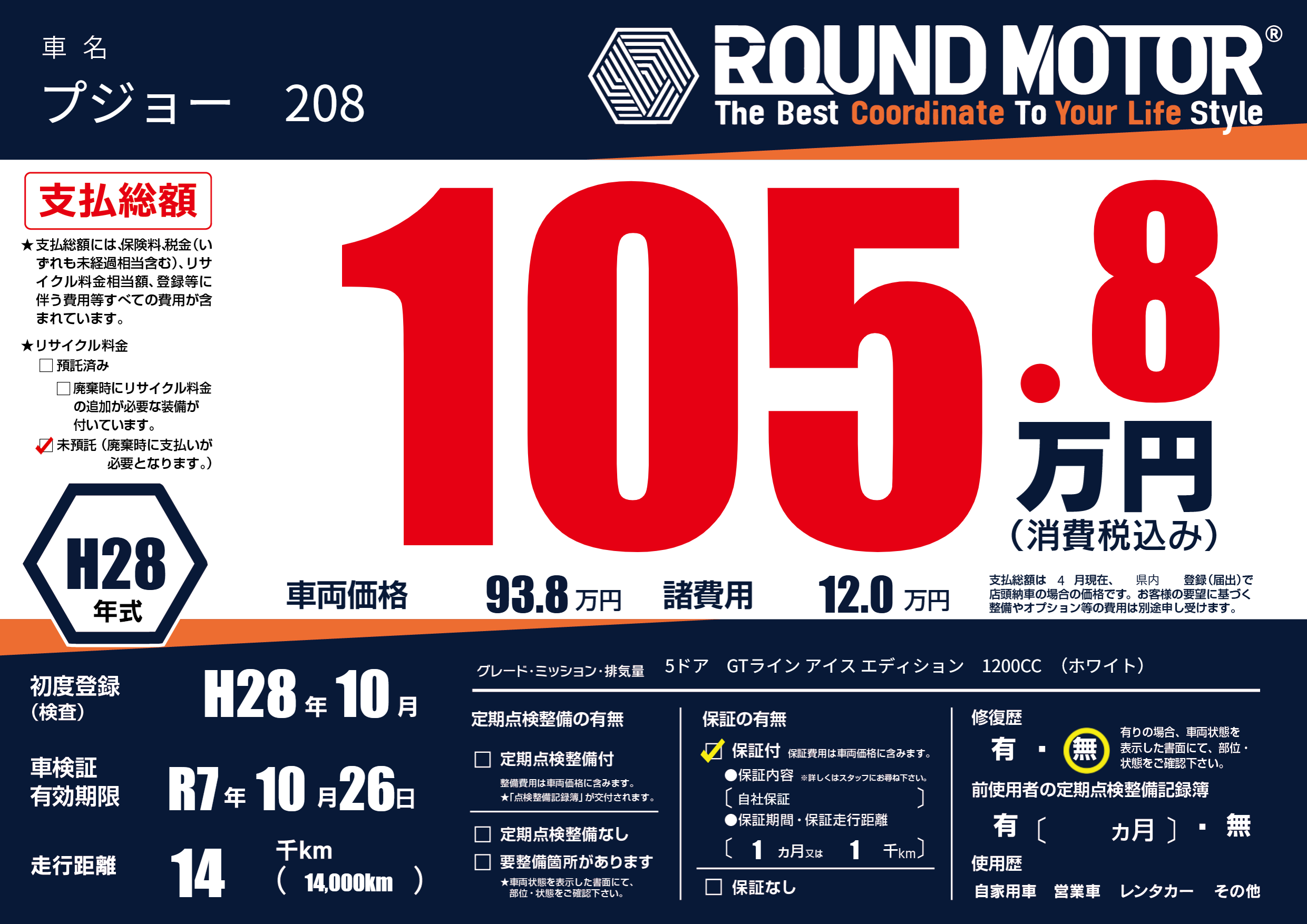 | 車名 | プジョー 208 | グレード ミッション 排気量 |