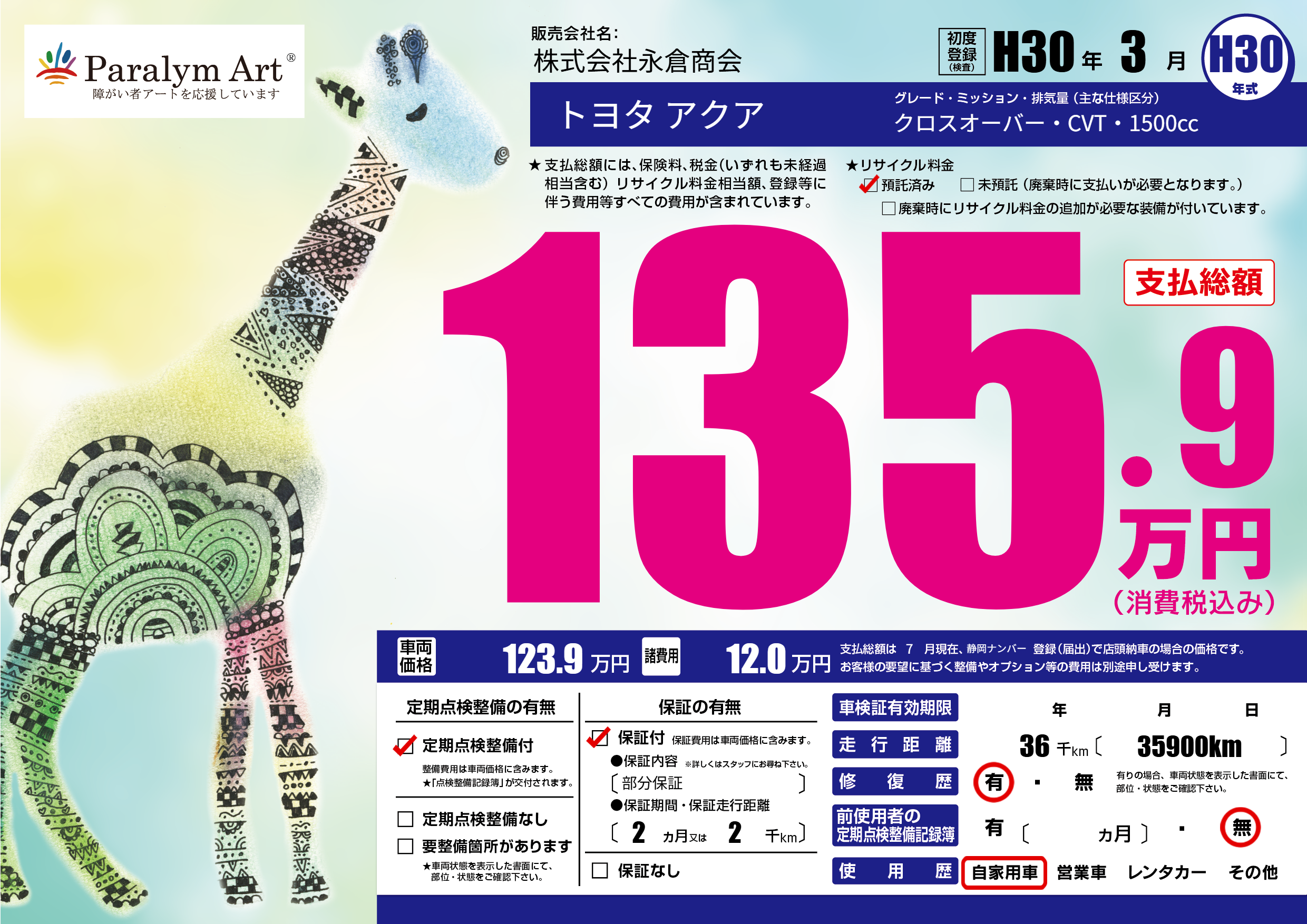 | 車名 | トヨタ アクア | グレード ミッション 排気量 |