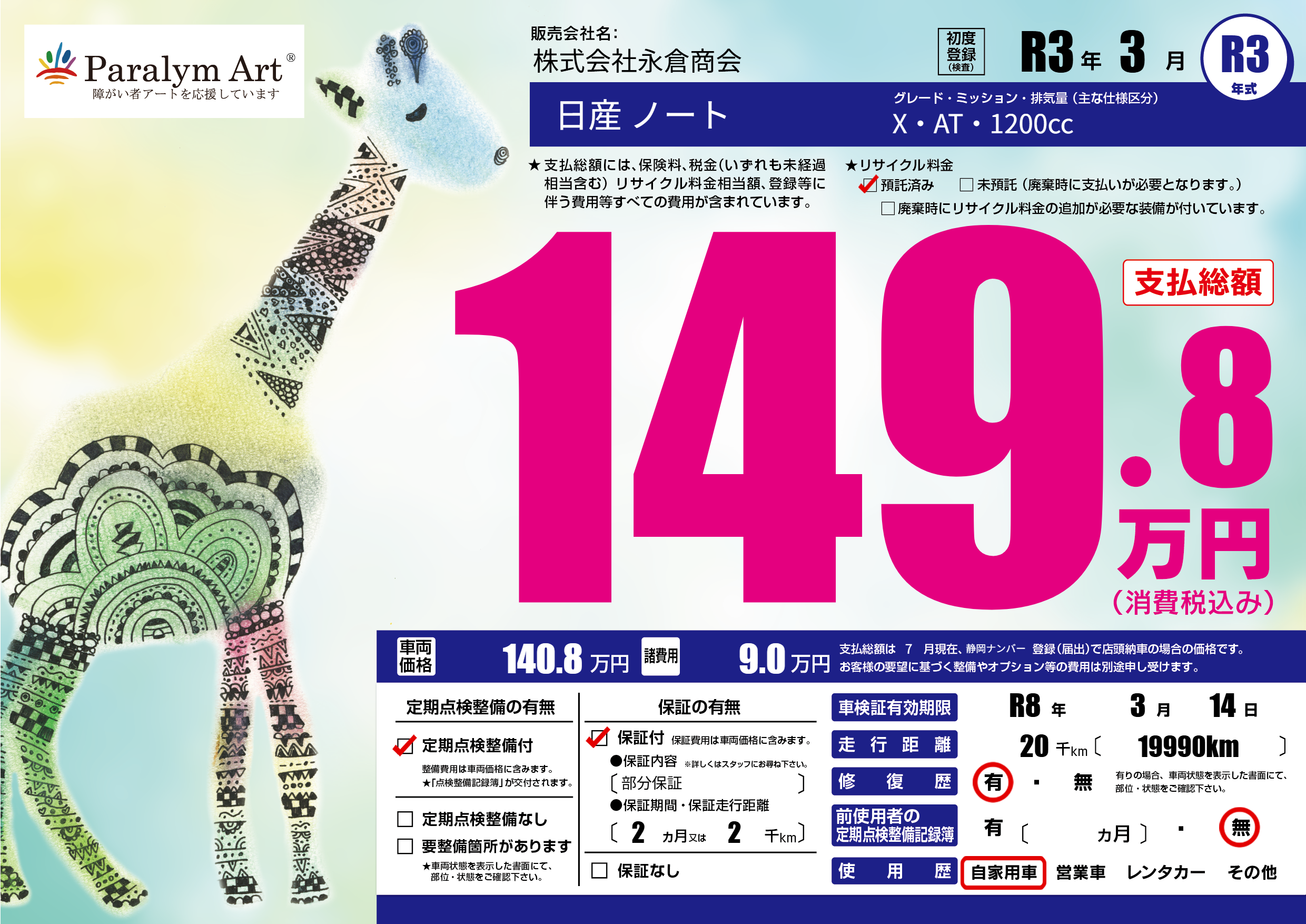 | 走行キロ | 2万km | 初年度登録 | R3年3月 |