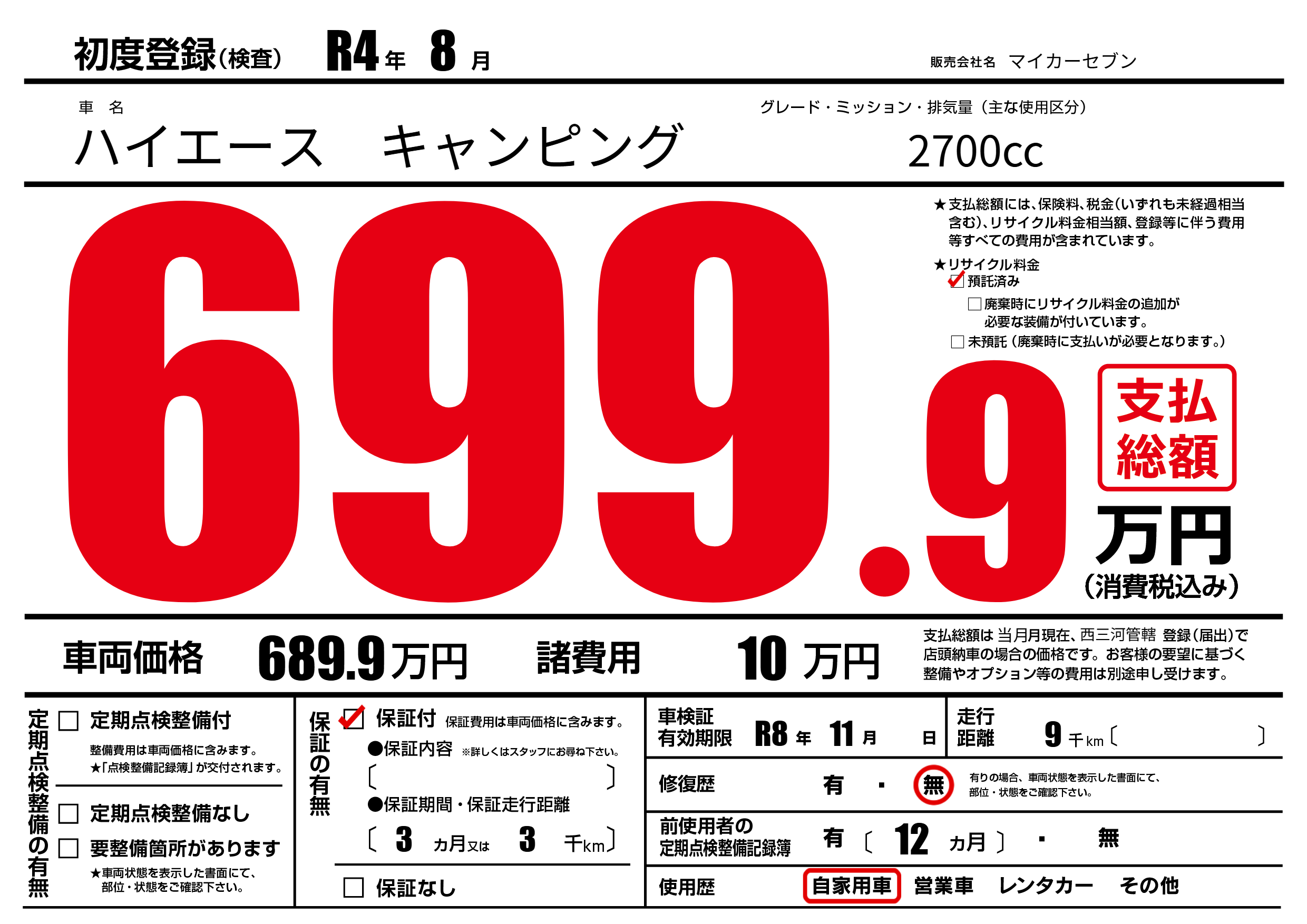 | 走行キロ | 0.9万km | 初年度登録 | R4年8月 |