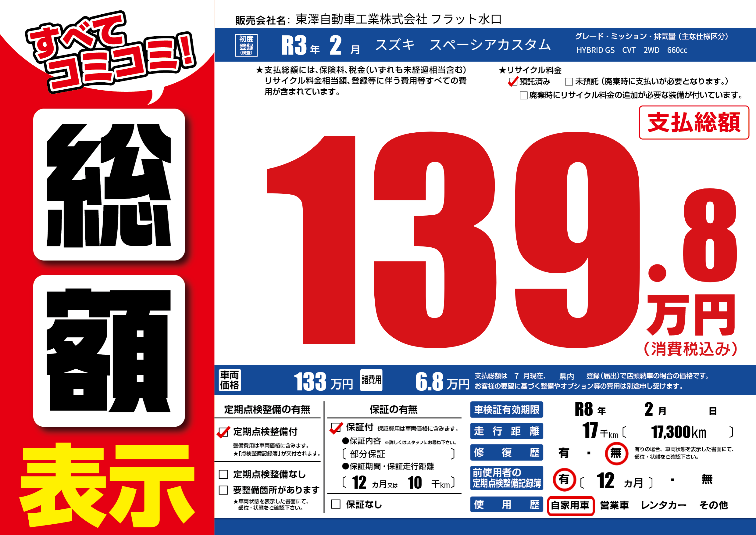 | 車名 | スズキ スペーシアカスタム | グレード ミッション 排気量 |