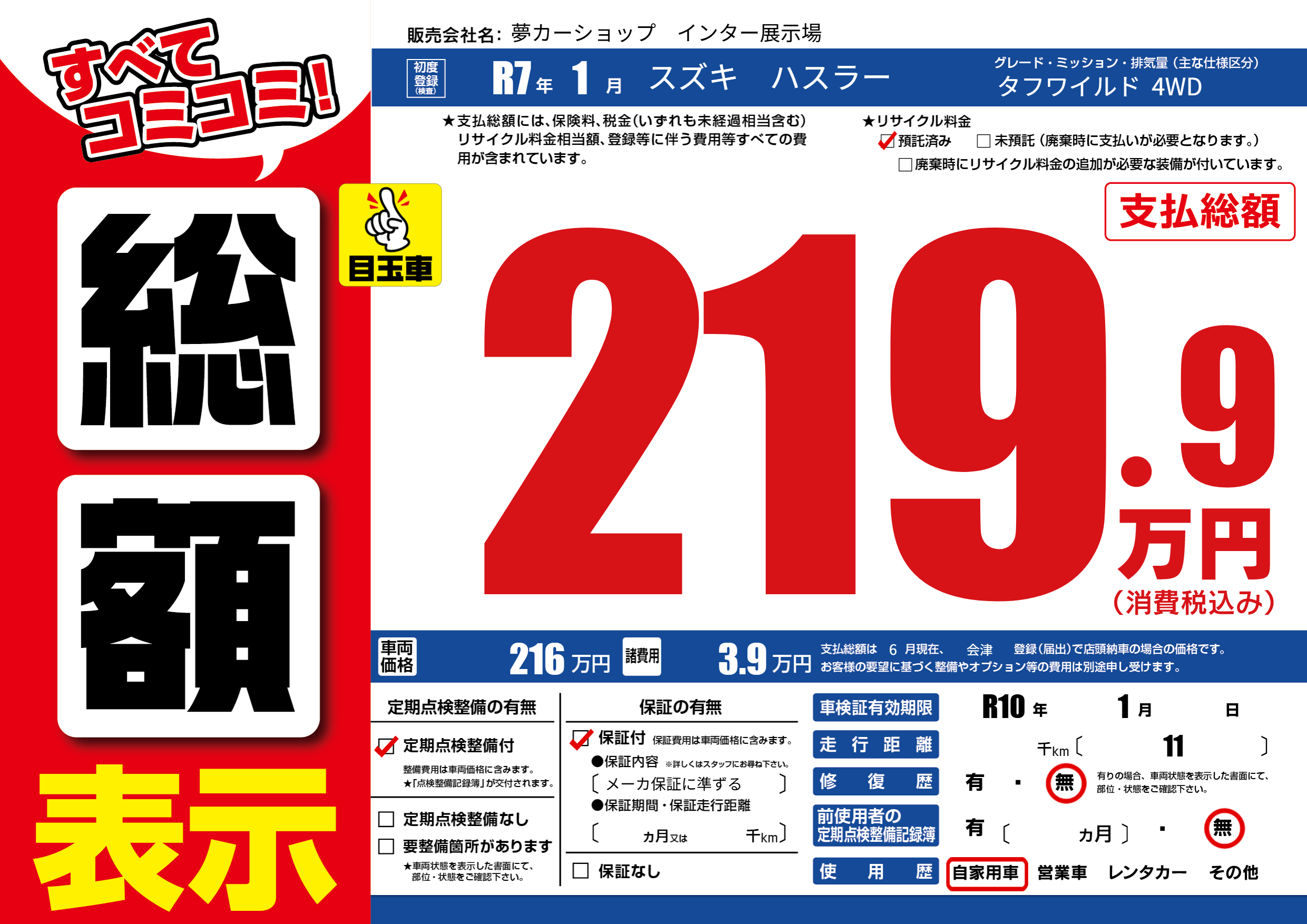 | 車名 | スズキ ハスラー | グレード ミッション 排気量 |