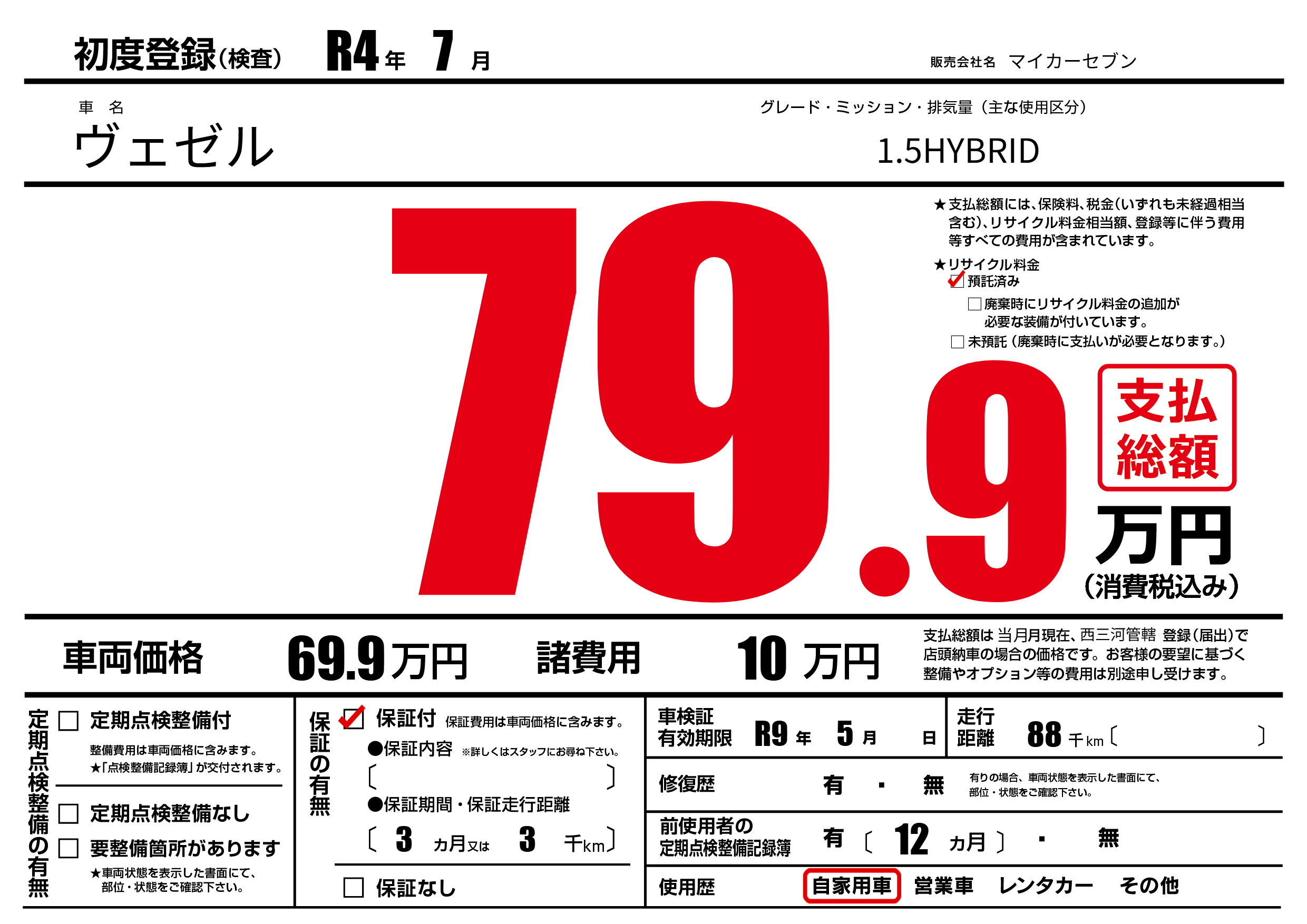 | 車名 | ヴェゼル | グレード ミッション 排気量 |