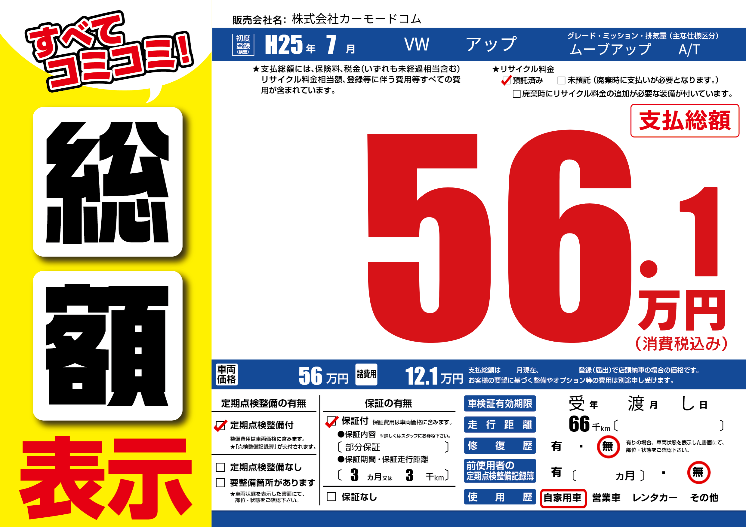 | 車名 | VW アップ | グレード ミッション 排気量 |