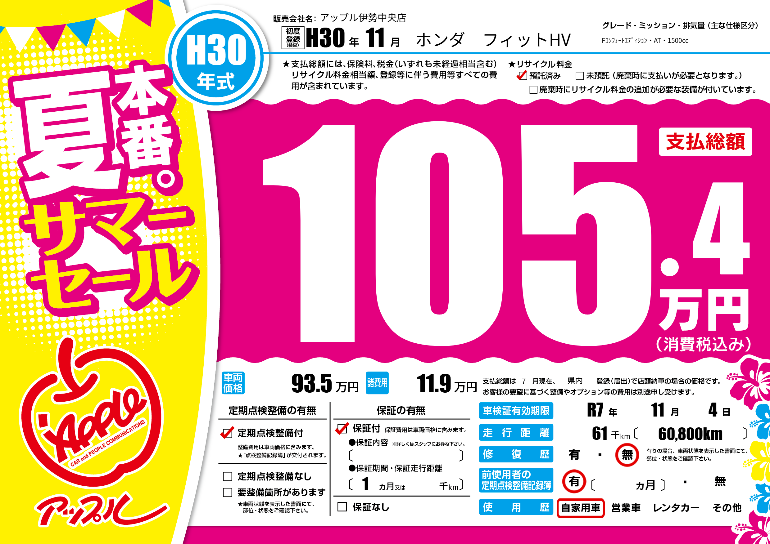 | 走行キロ | 6.1万km | 初年度登録 | H30年11月 |