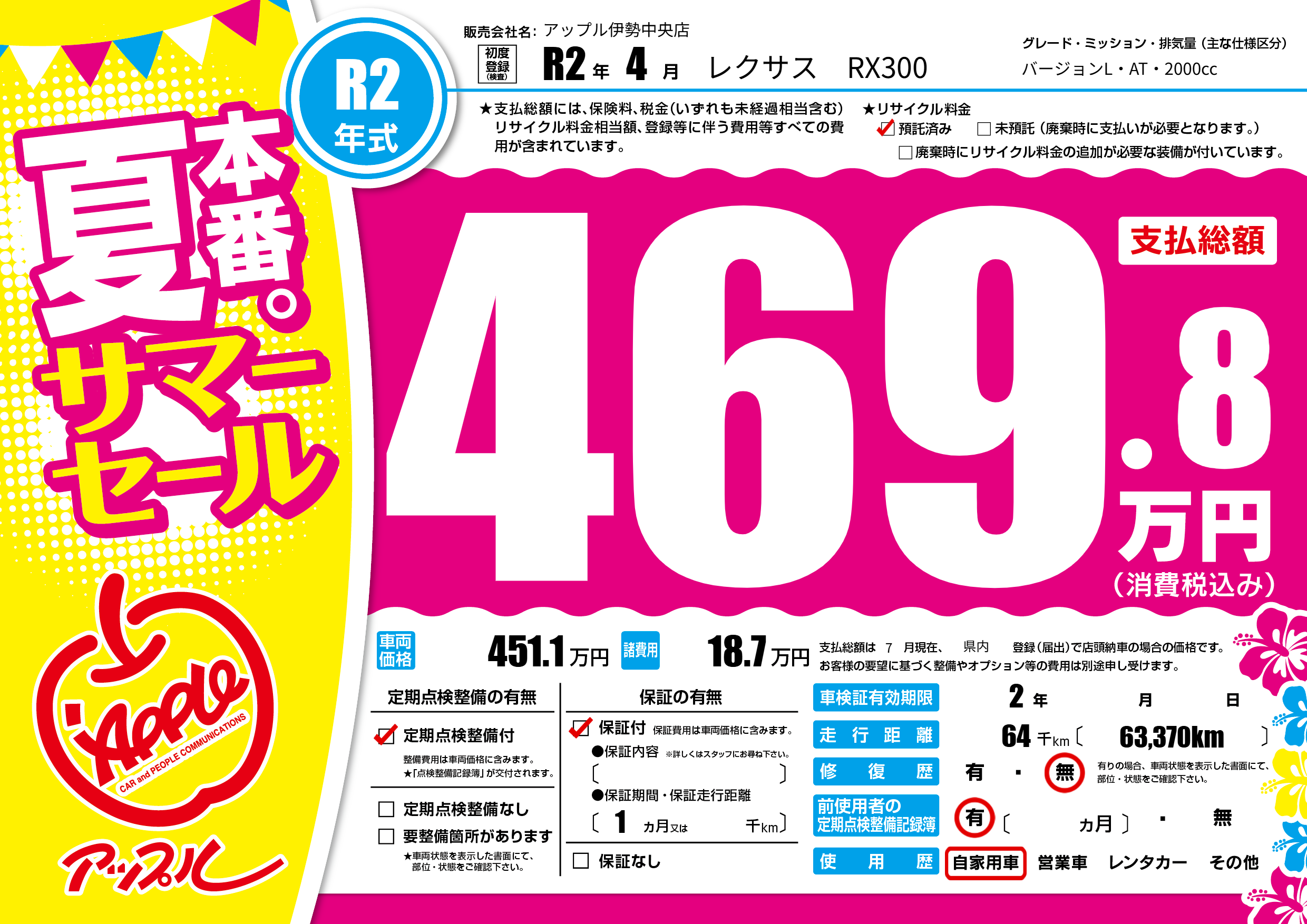 | 車名 | レクサス RX300 | グレード ミッション 排気量 |