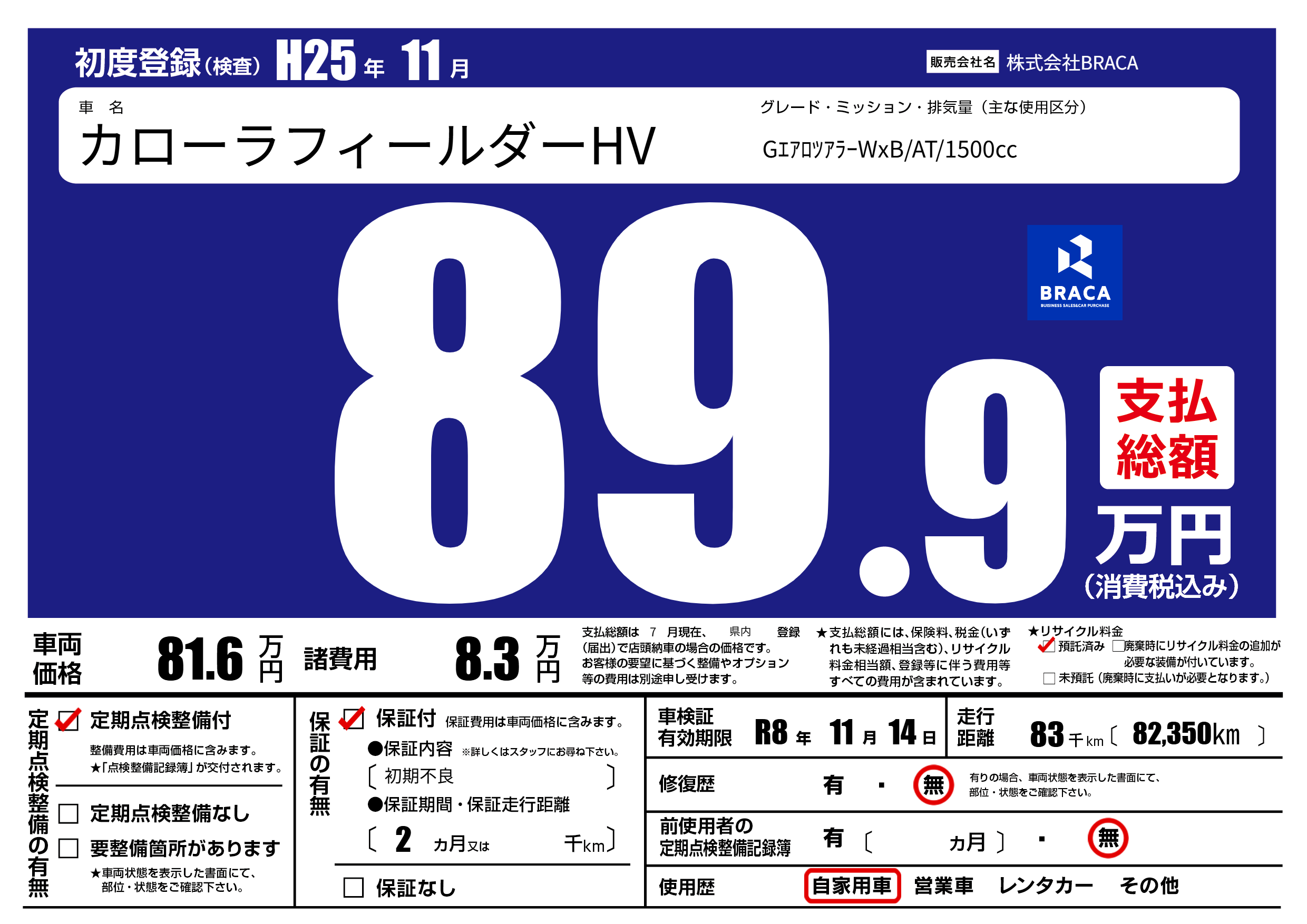 | 走行キロ | 8.3万km | 初年度登録 | H25年11月 |