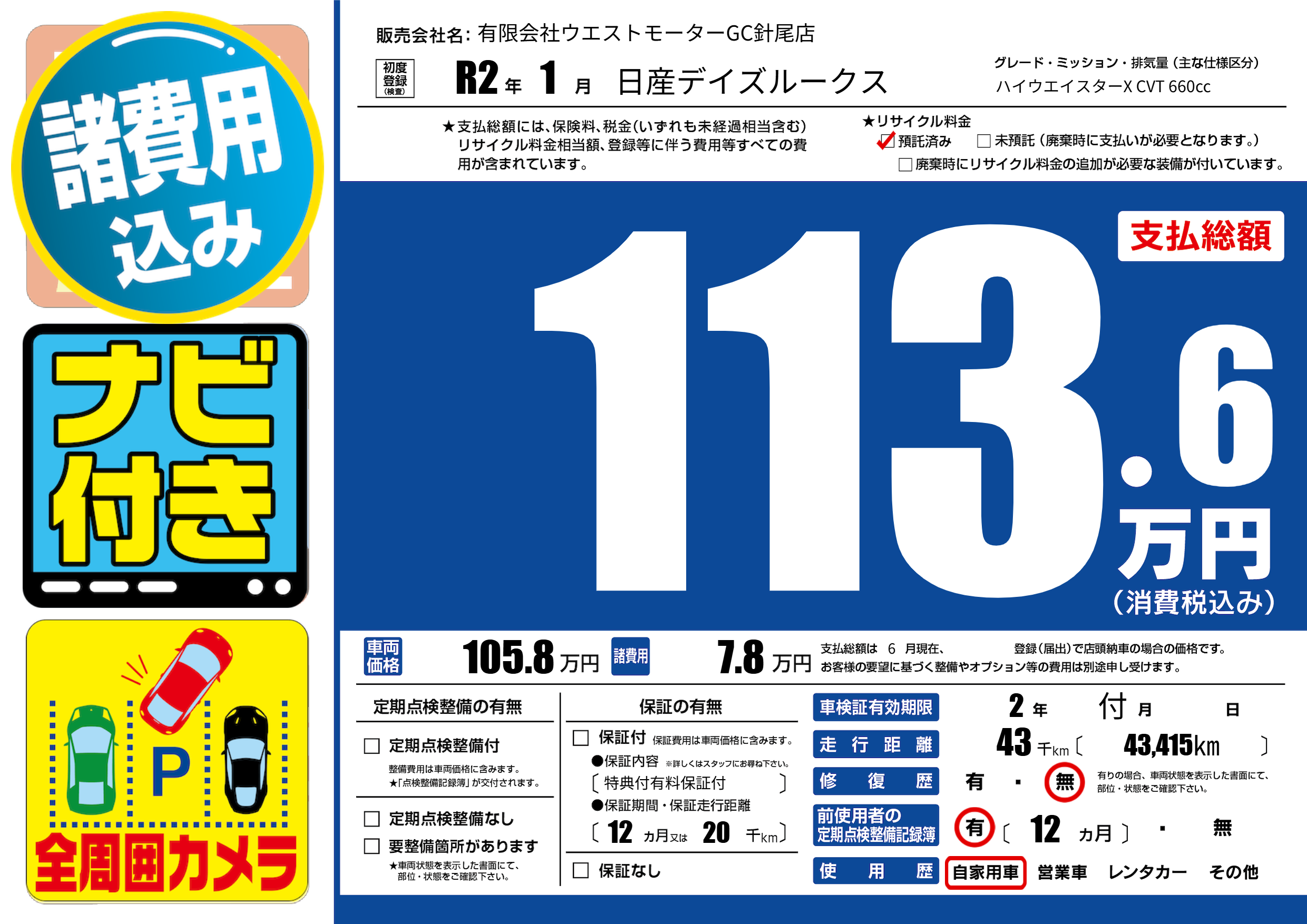 | 走行キロ | 4.3万km | 初年度登録 | R2年1月 |