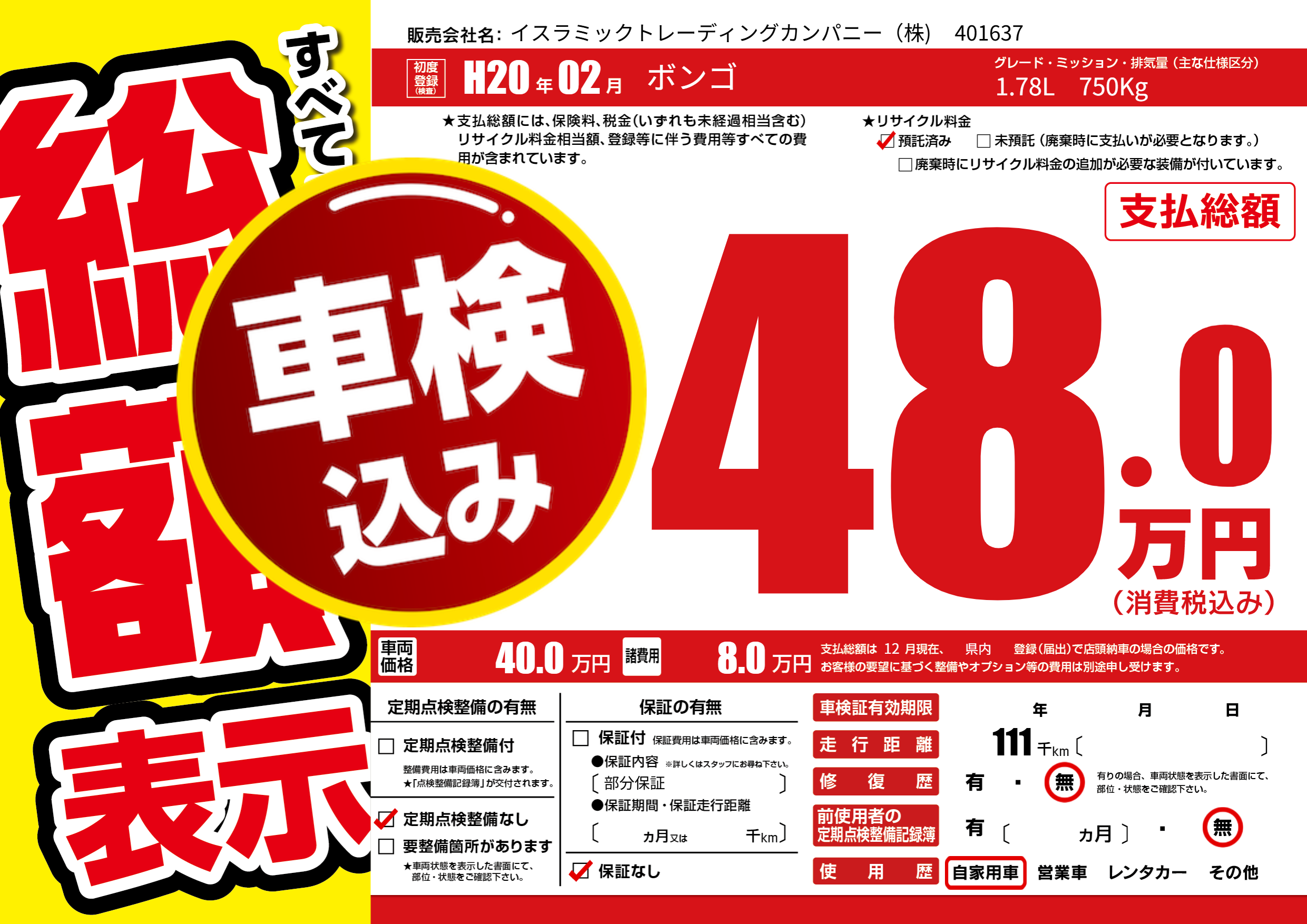 | 車名 | ボンゴ | グレード ミッション 排気量 |