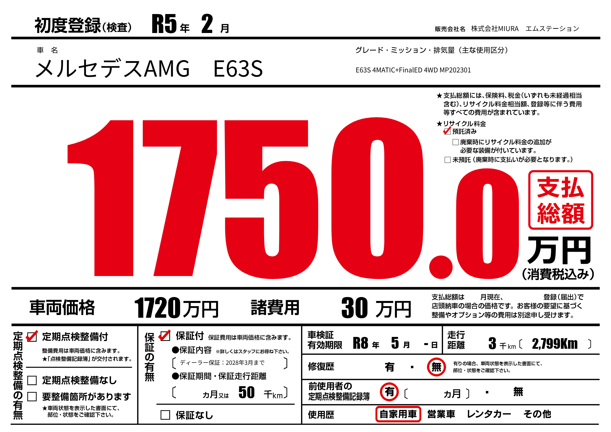 | 車名 | メルセデスAMG E63S | グレード ミッション 排気量 |