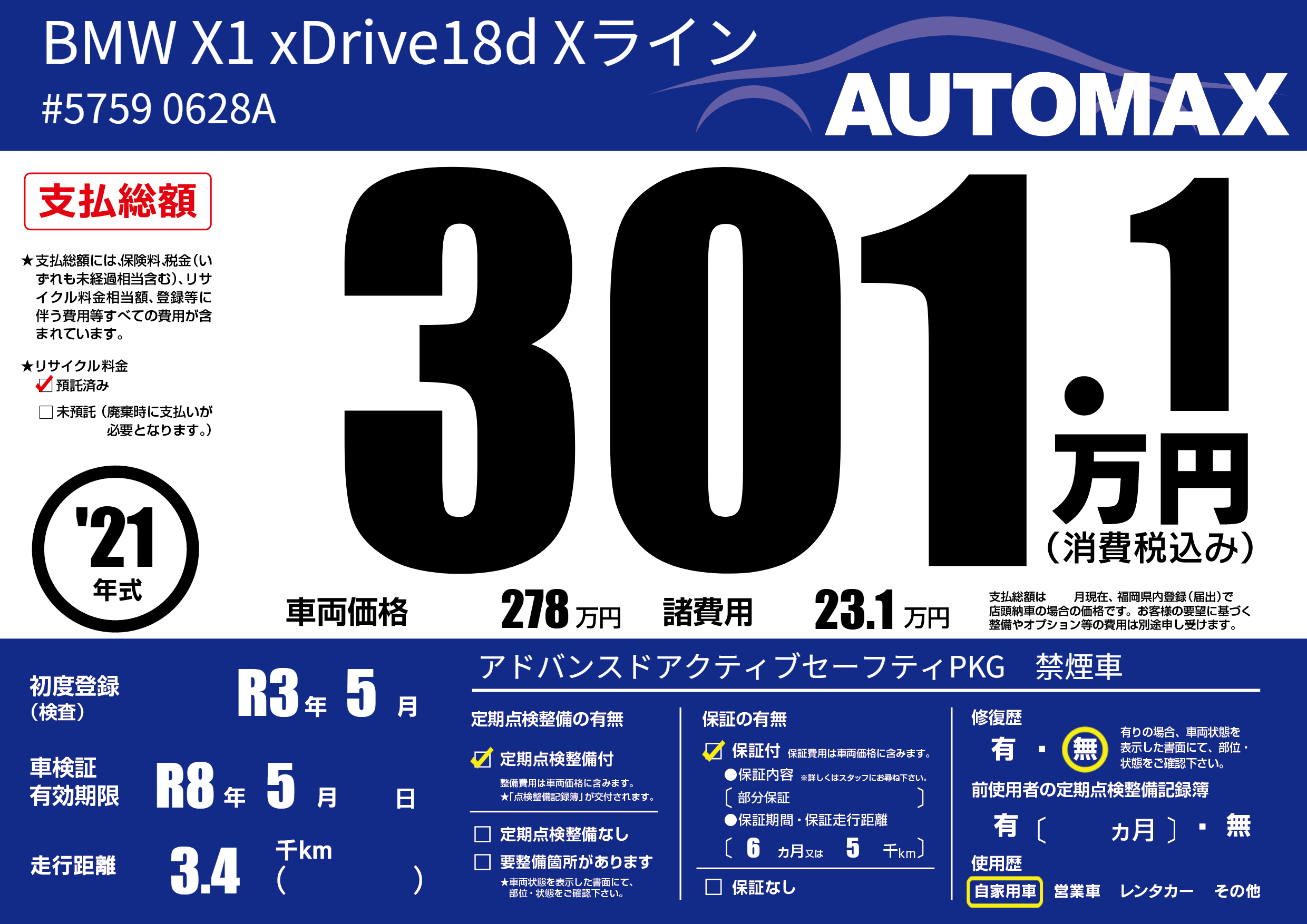 | 車名 | BMW X1 xDrive18d Xライン | グレード ミッション 排気量 |