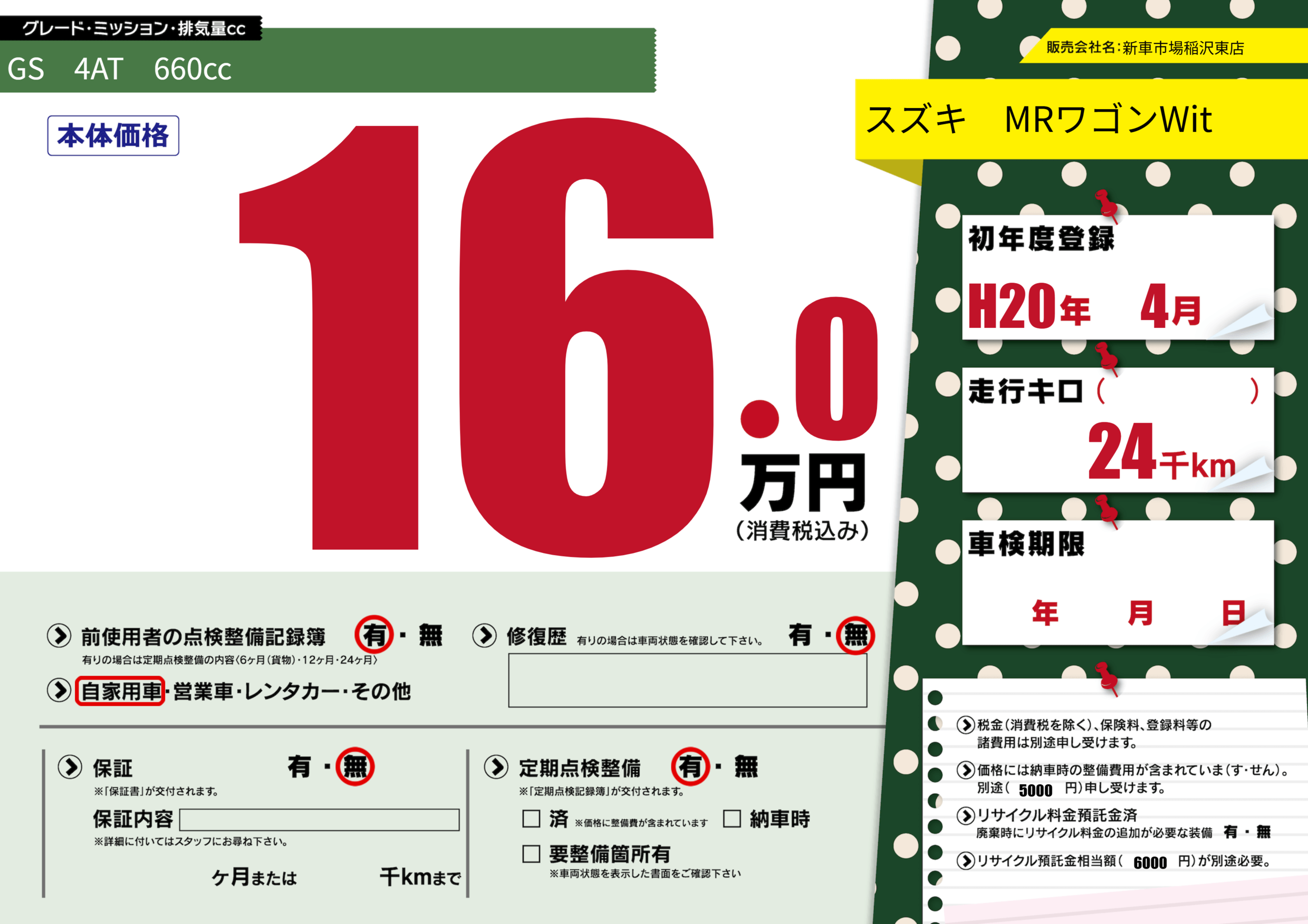 | 車名 | スズキ MRワゴンWit | グレード ミッション 排気量 |