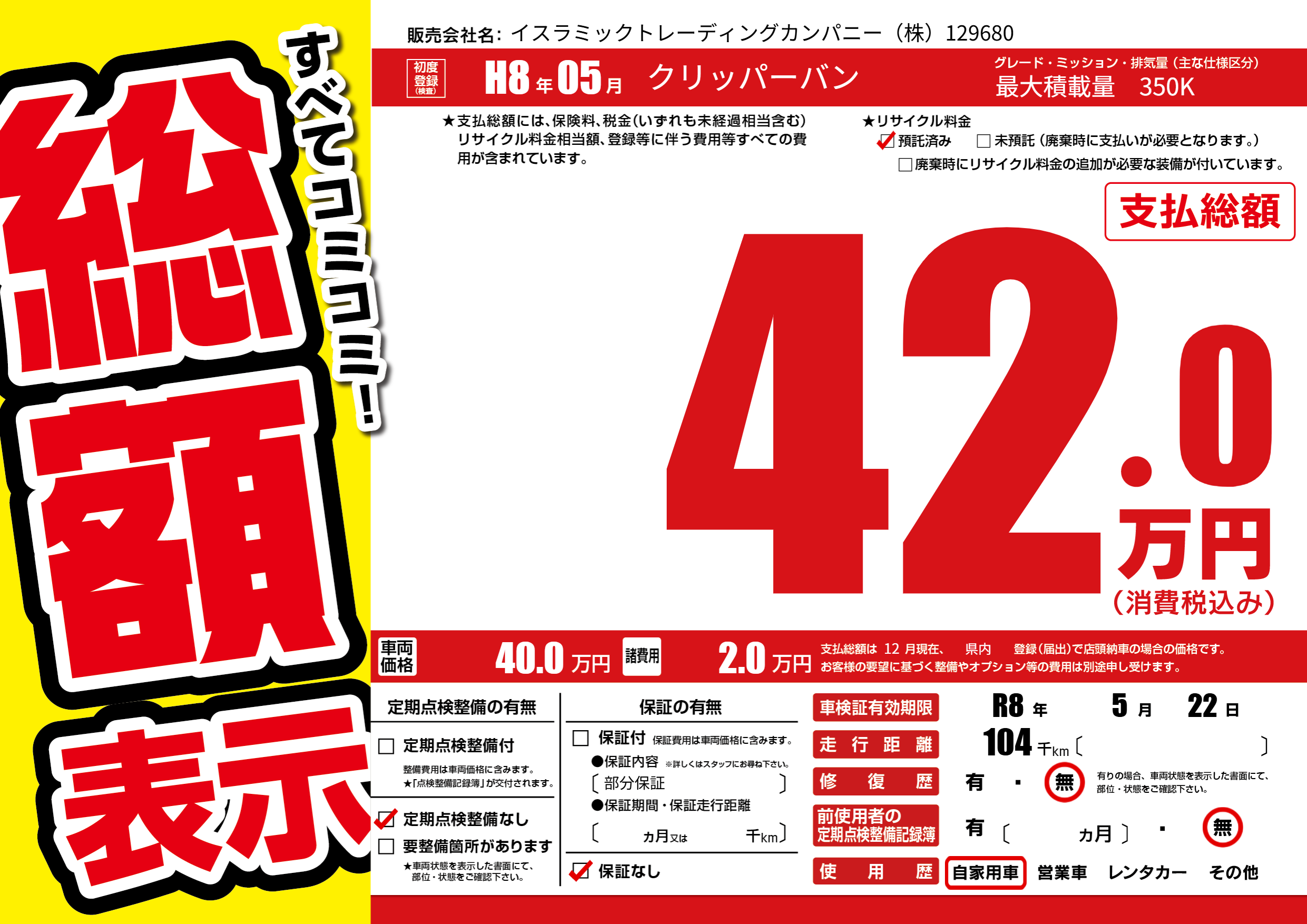 | 走行キロ | 10.4万km | 初年度登録 | H8年05月 |