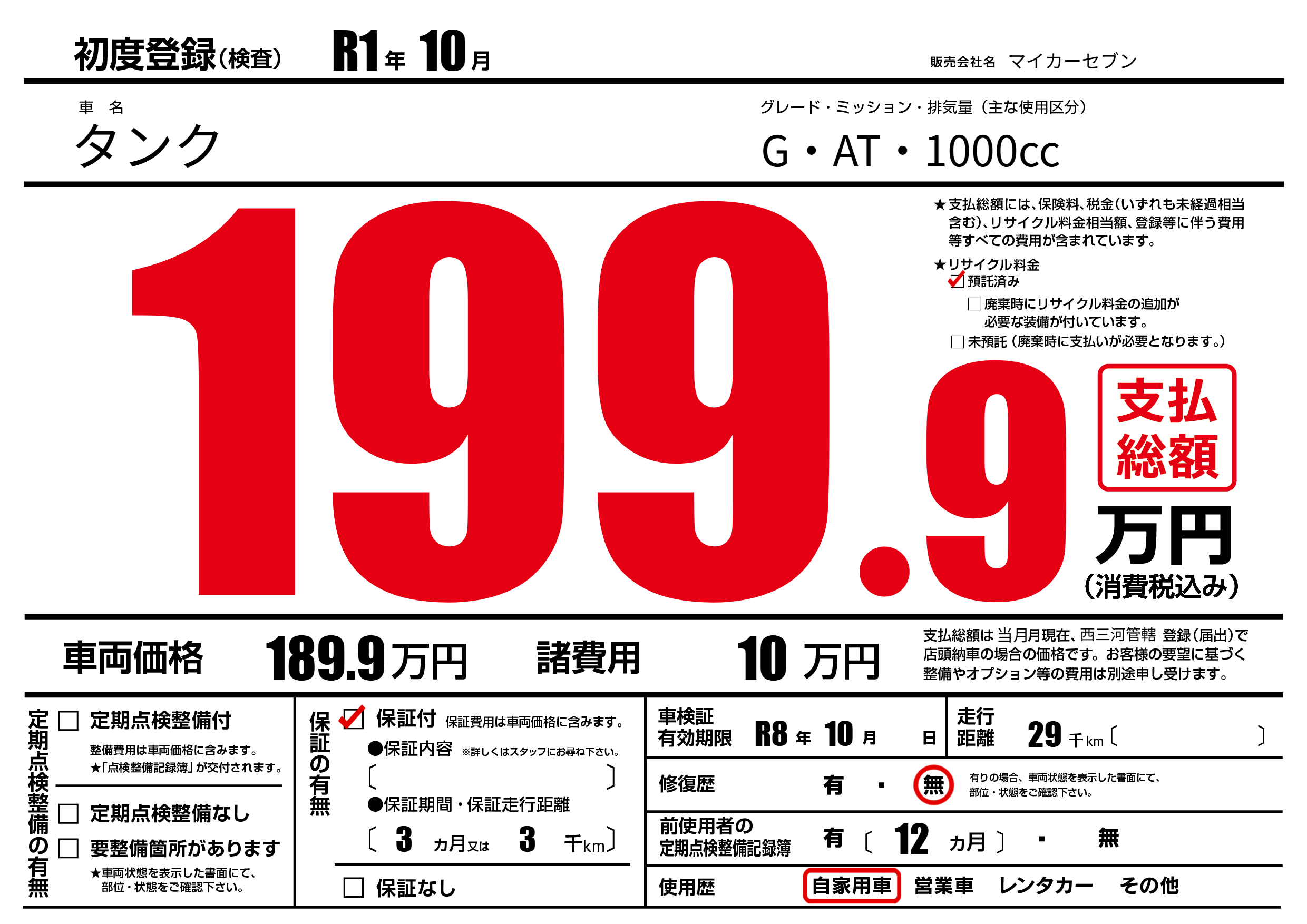 | 走行キロ | 2.9万km | 初年度登録 | R1年10月 |