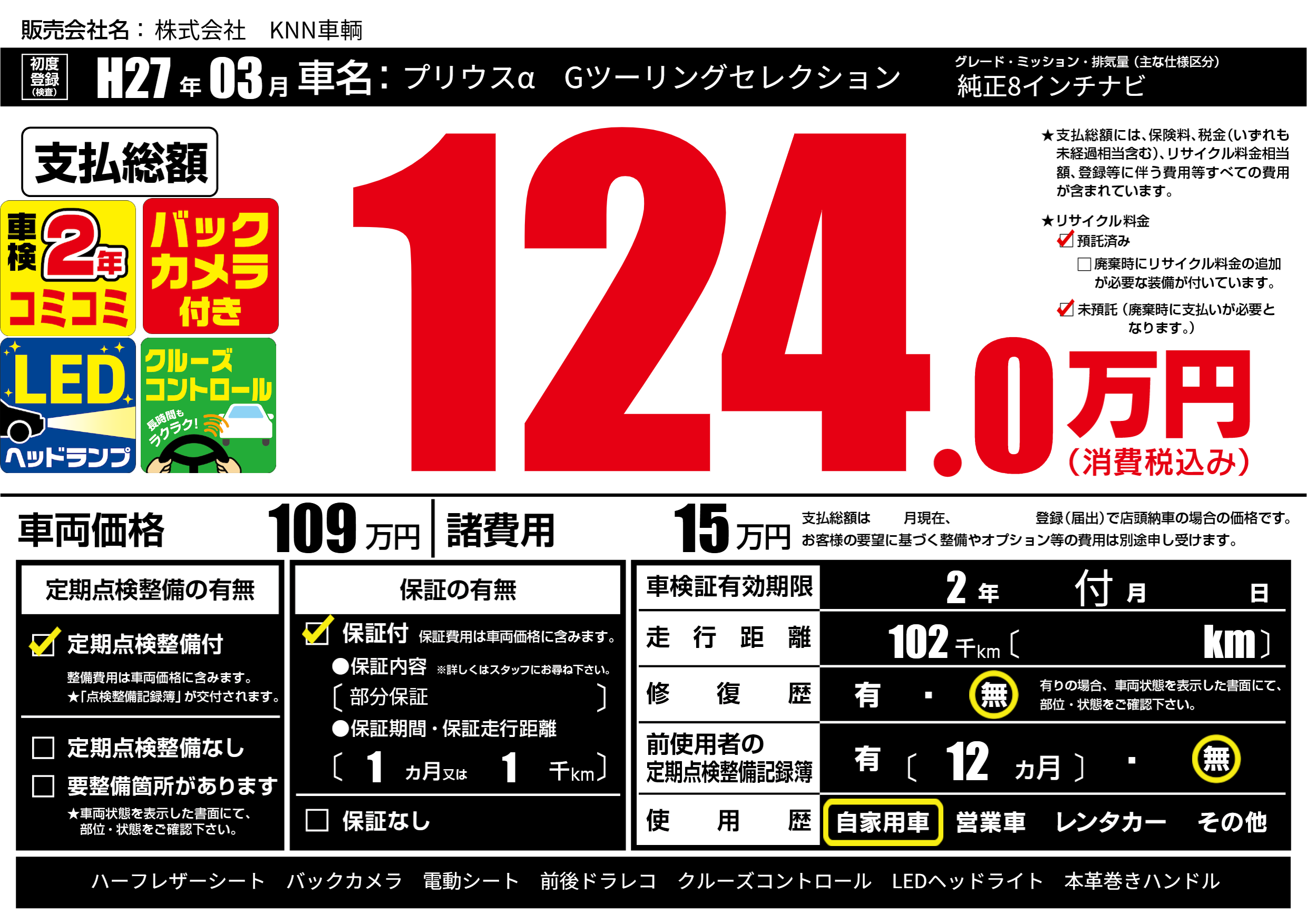 | 車名 | プリウスα Gツーリングセレクション | グレード ミッション 排気量 |