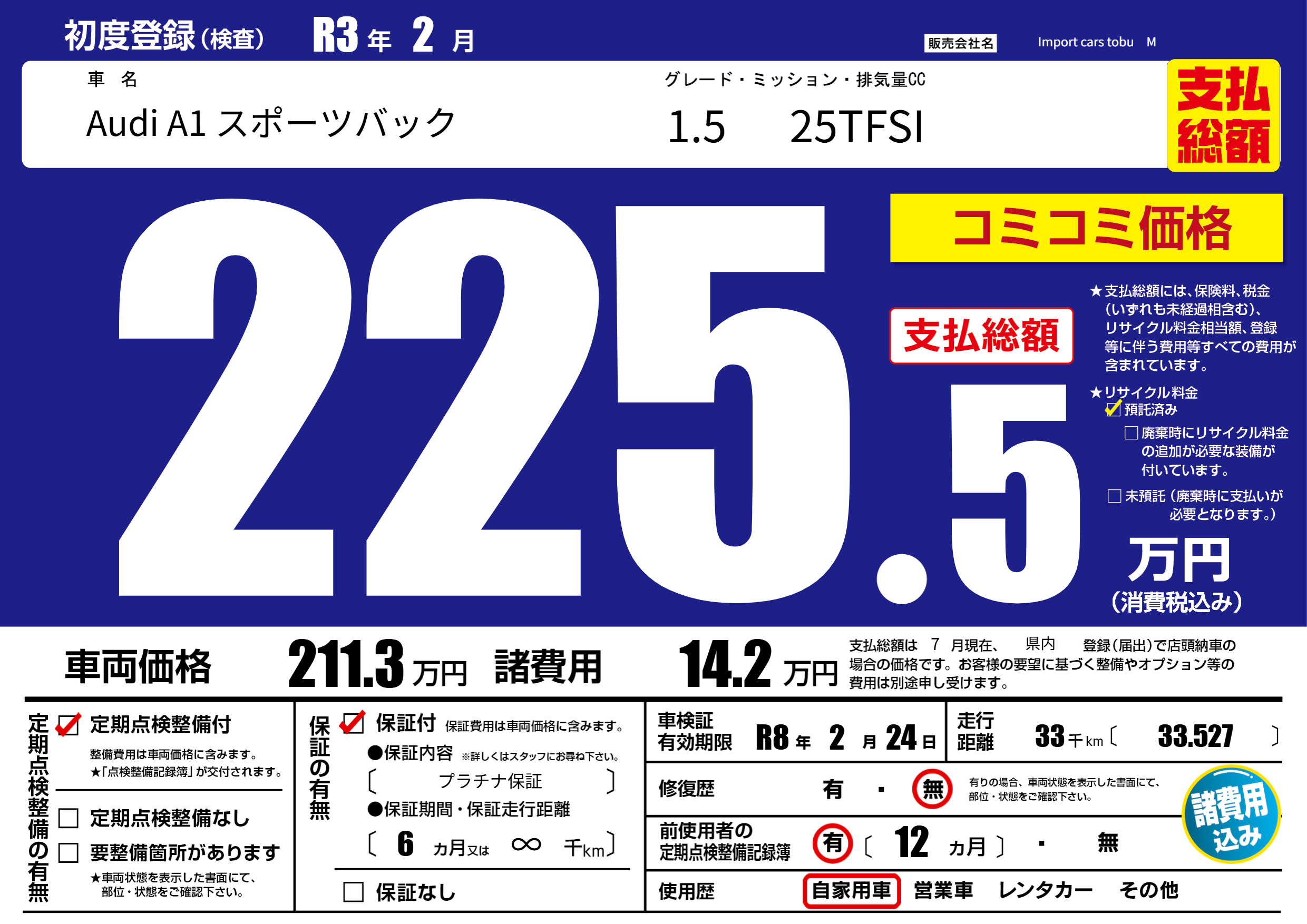 | 走行キロ | 3.3万km | 初年度登録 | R3年2月 |