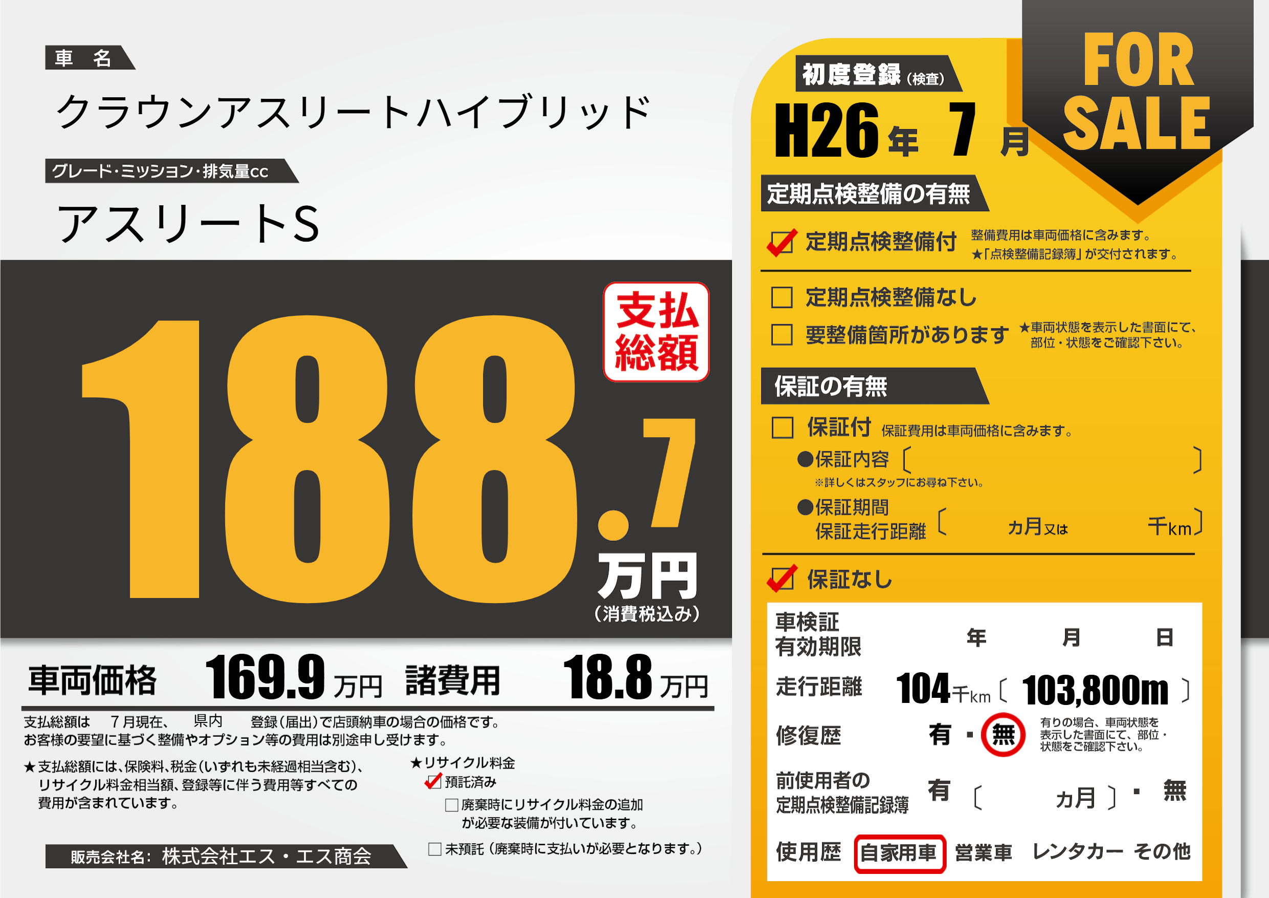 | 走行キロ | 10.4万km | 初年度登録 | H26年7月 |