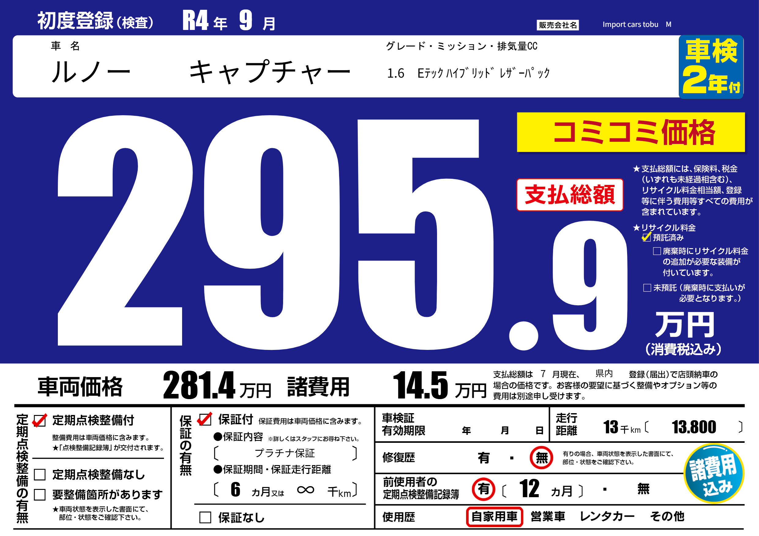 | 車名 | ルノー キャプチャー | グレード ミッション 排気量 |