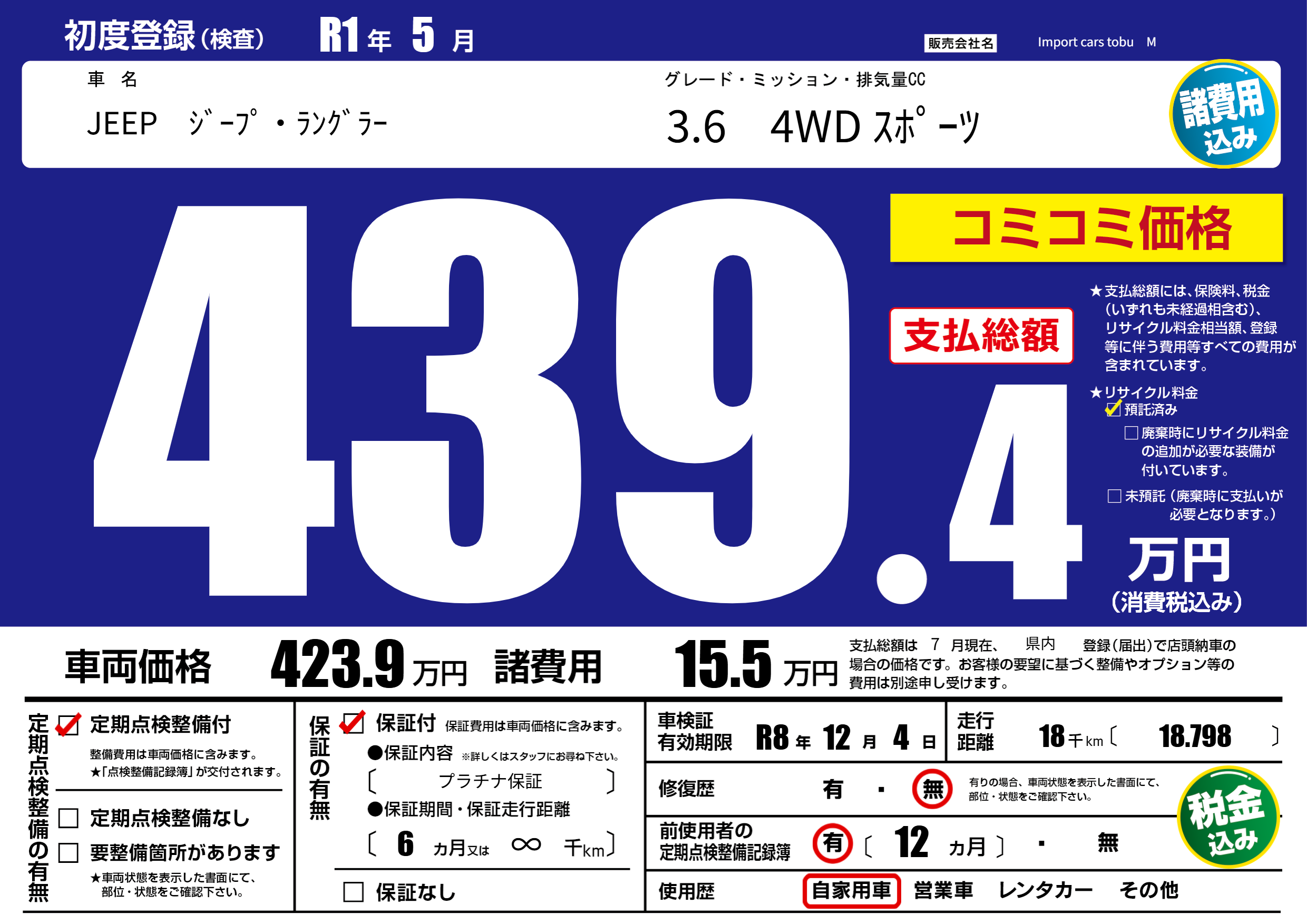 | 車名 | JEEP ジープ・ラングラー | グレード ミッション 排気量 |