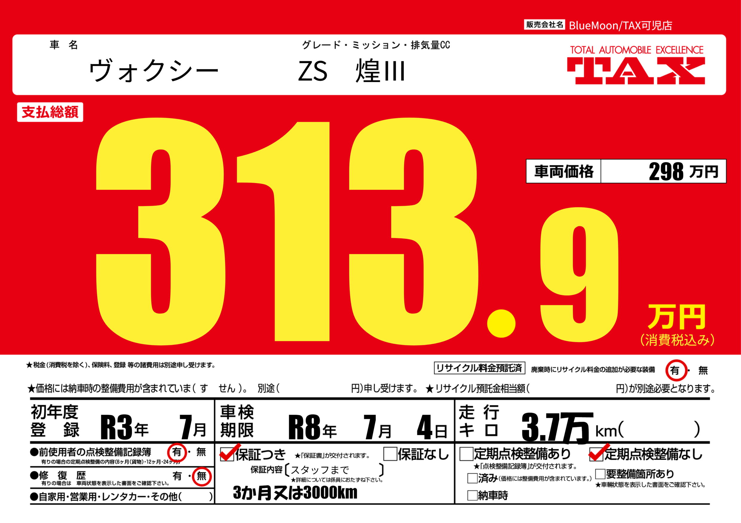 | 走行キロ | 0.3万km | 初年度登録 | R3年7月 |