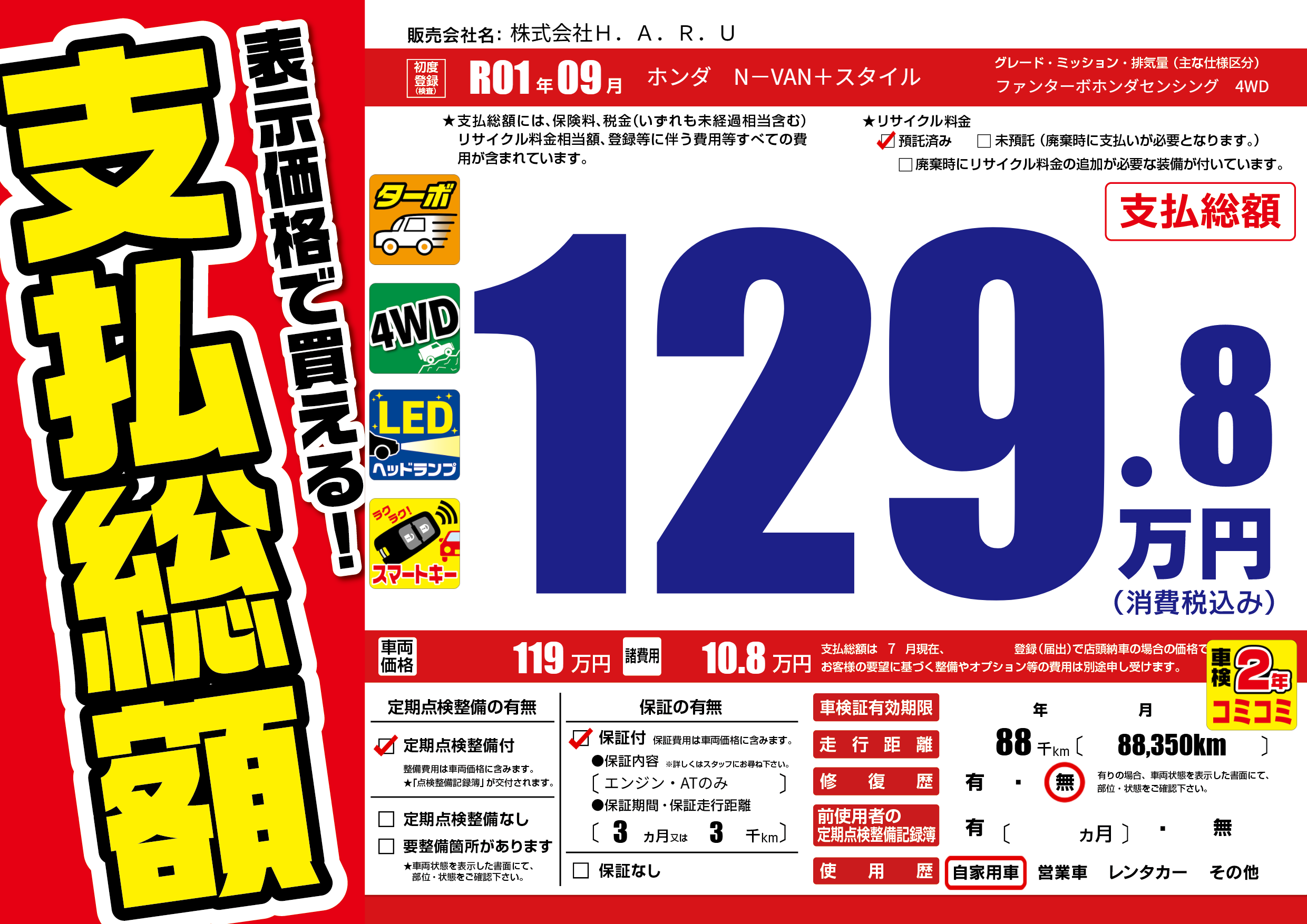 | 車名 | ホンダ N-VAN+スタイル | グレード ミッション 排気量 |