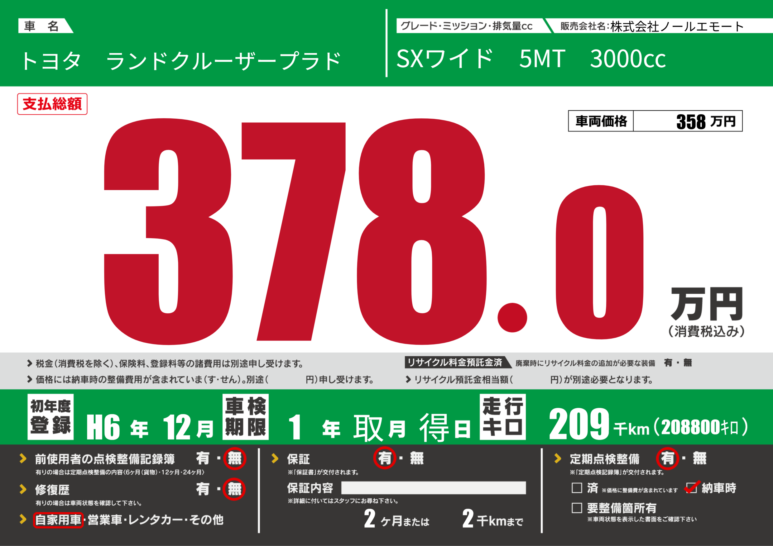 | 車名 | トヨタ ランドクルーザープラド | グレード ミッション 排気量 |