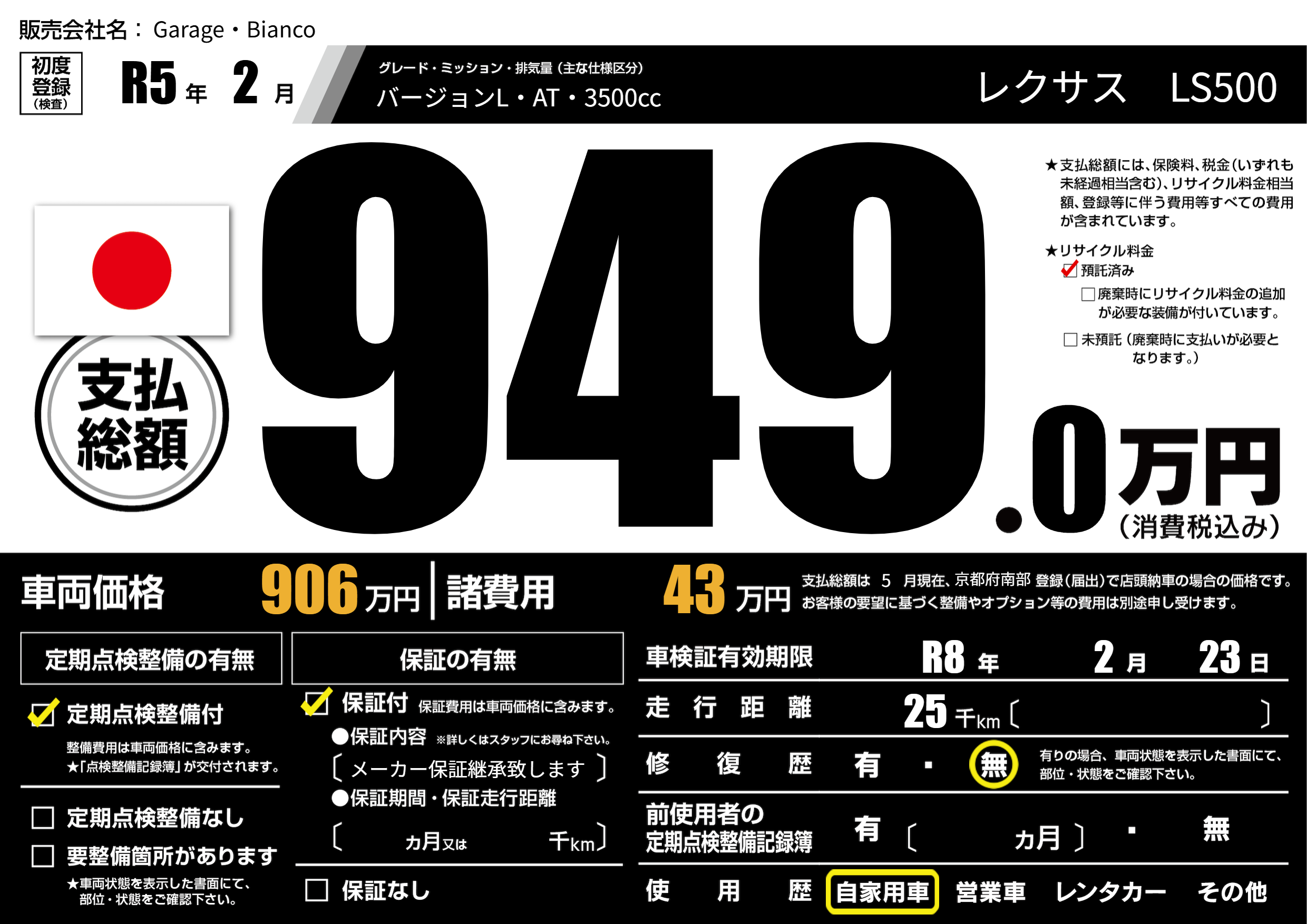 | 車名 | レクサス LS500 | グレード ミッション 排気量 |