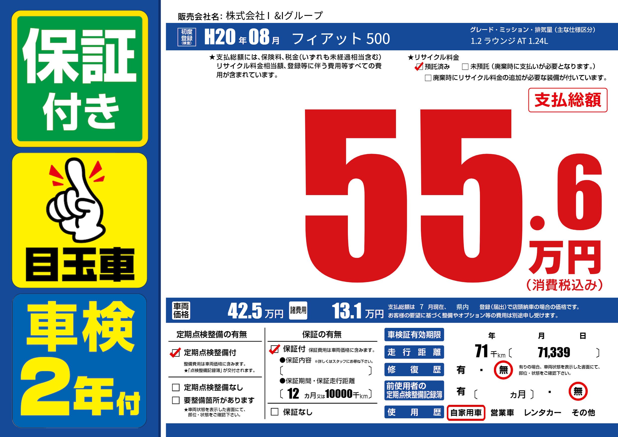 | 車名 | フィアット 500 | グレード ミッション 排気量 |