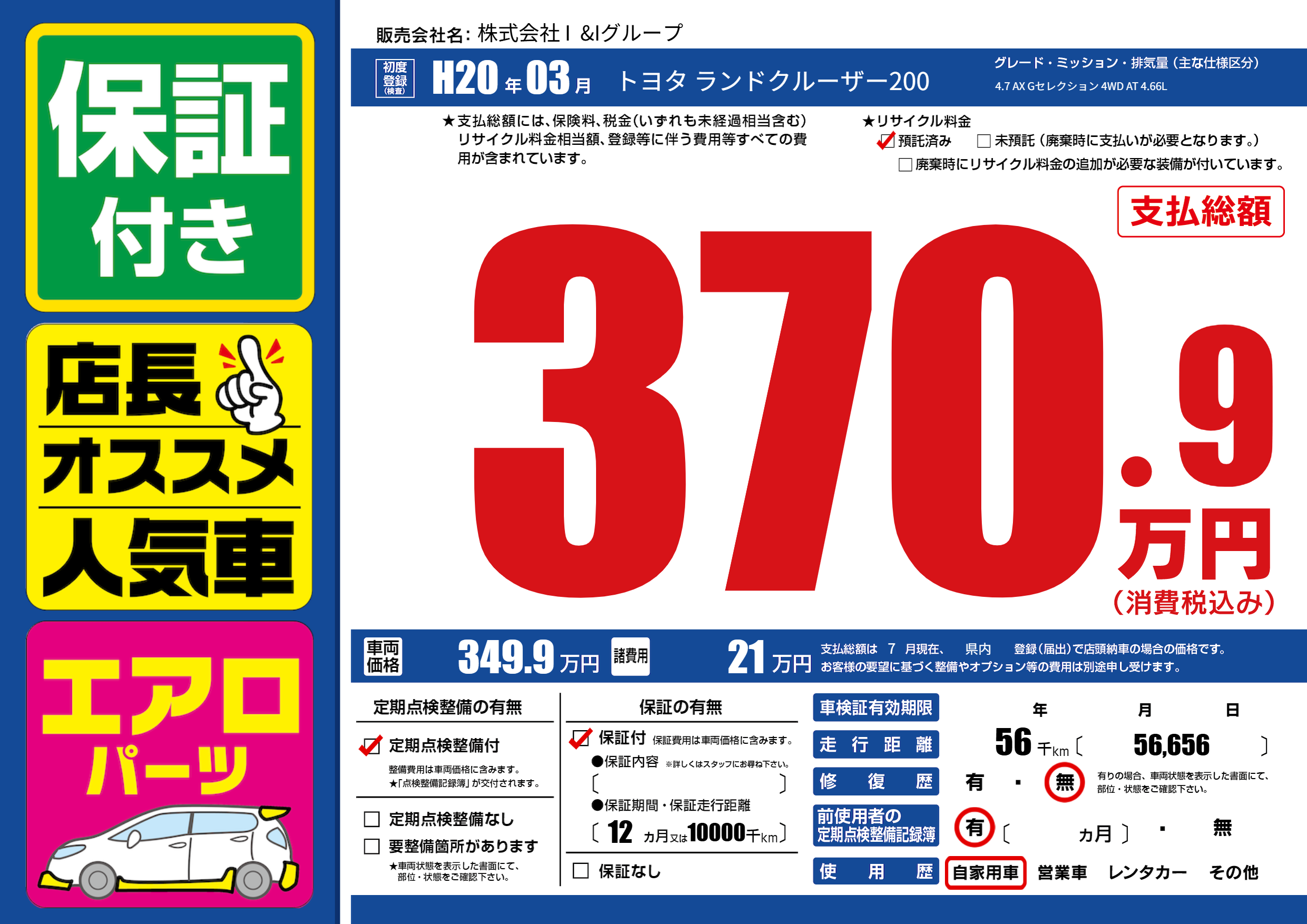 | 車名 | トヨタ ランドクルーザー200 | グレード ミッション 排気量 |