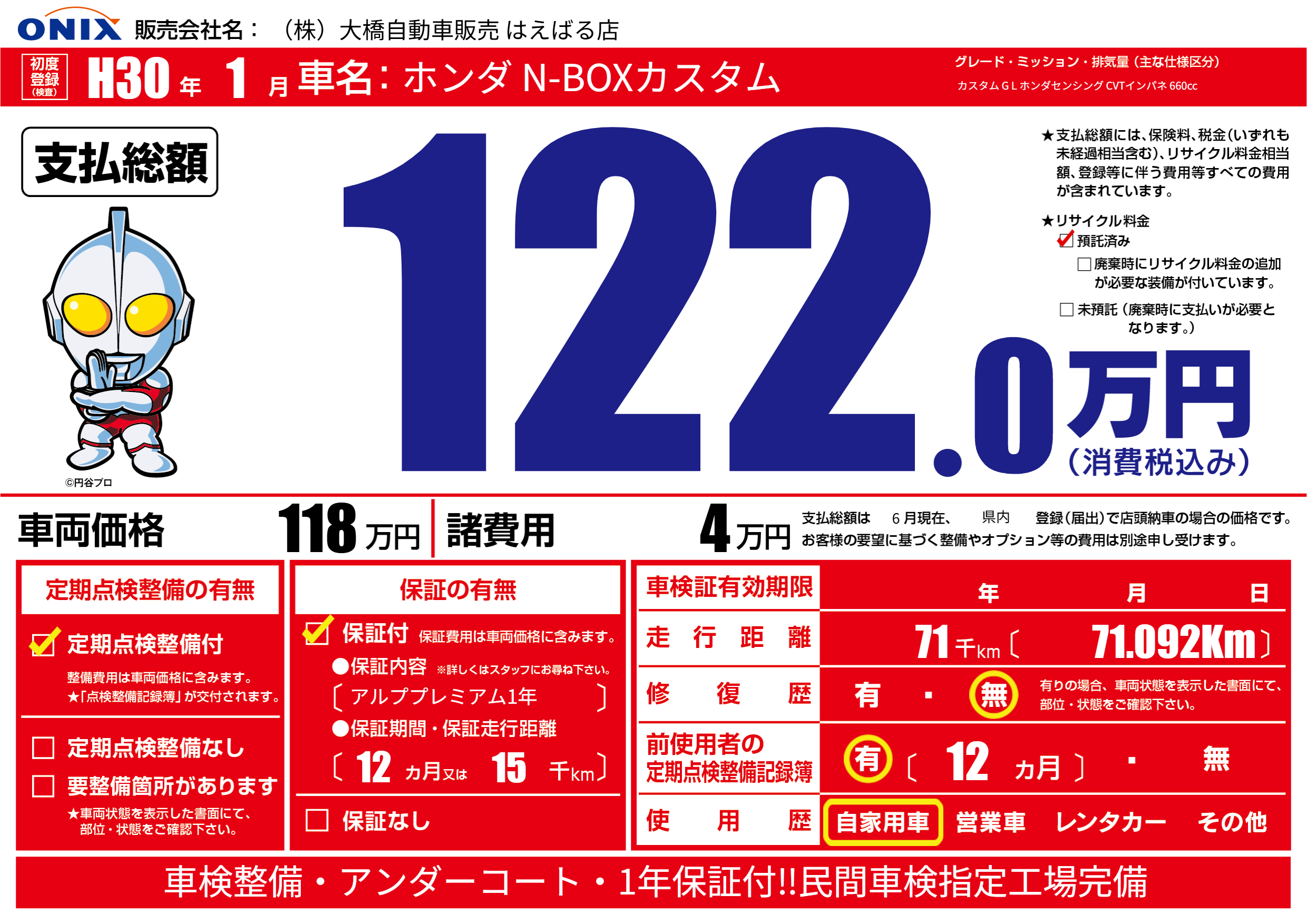 保証付き 保証内容(アルププレミアム1年) 12ヶ月または(15)千kmまで |